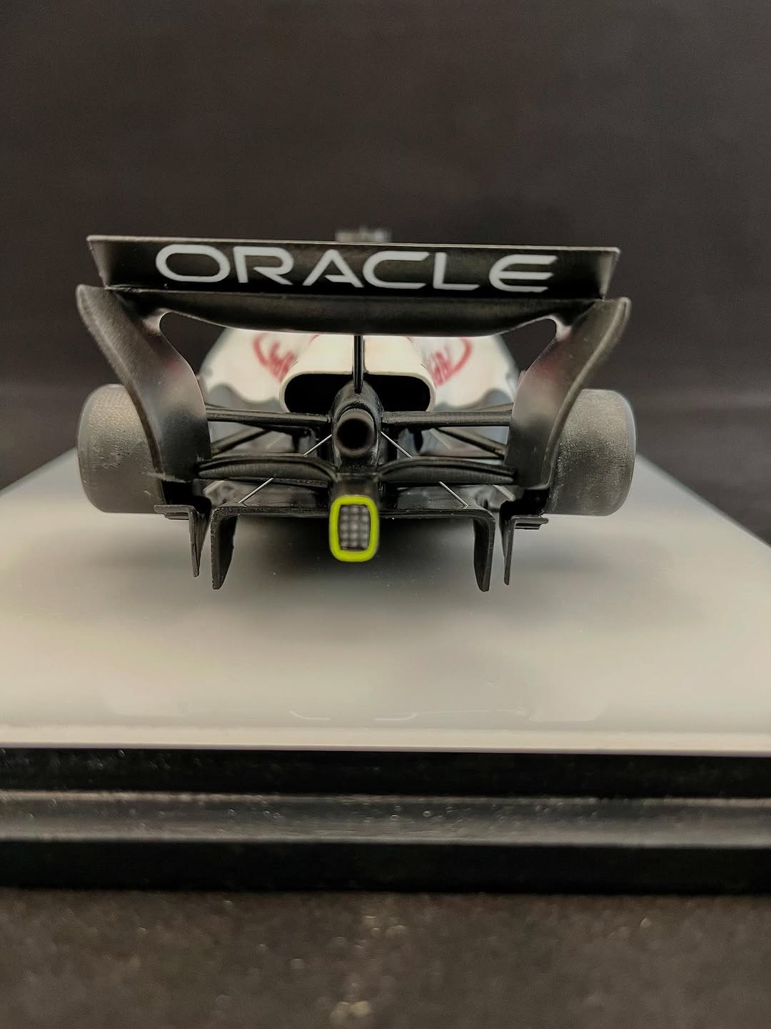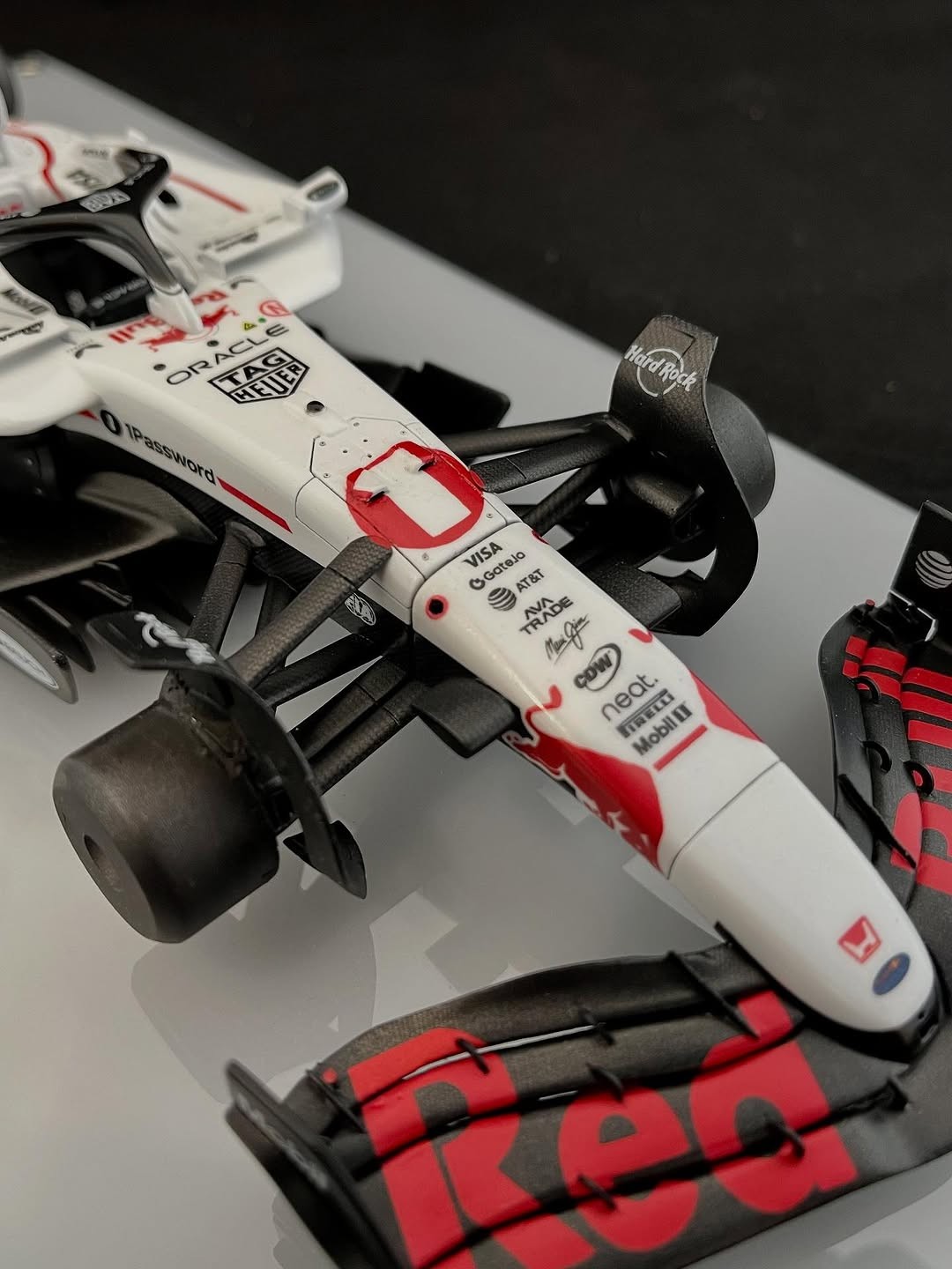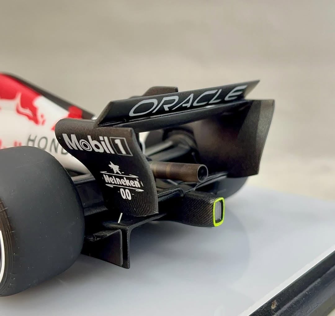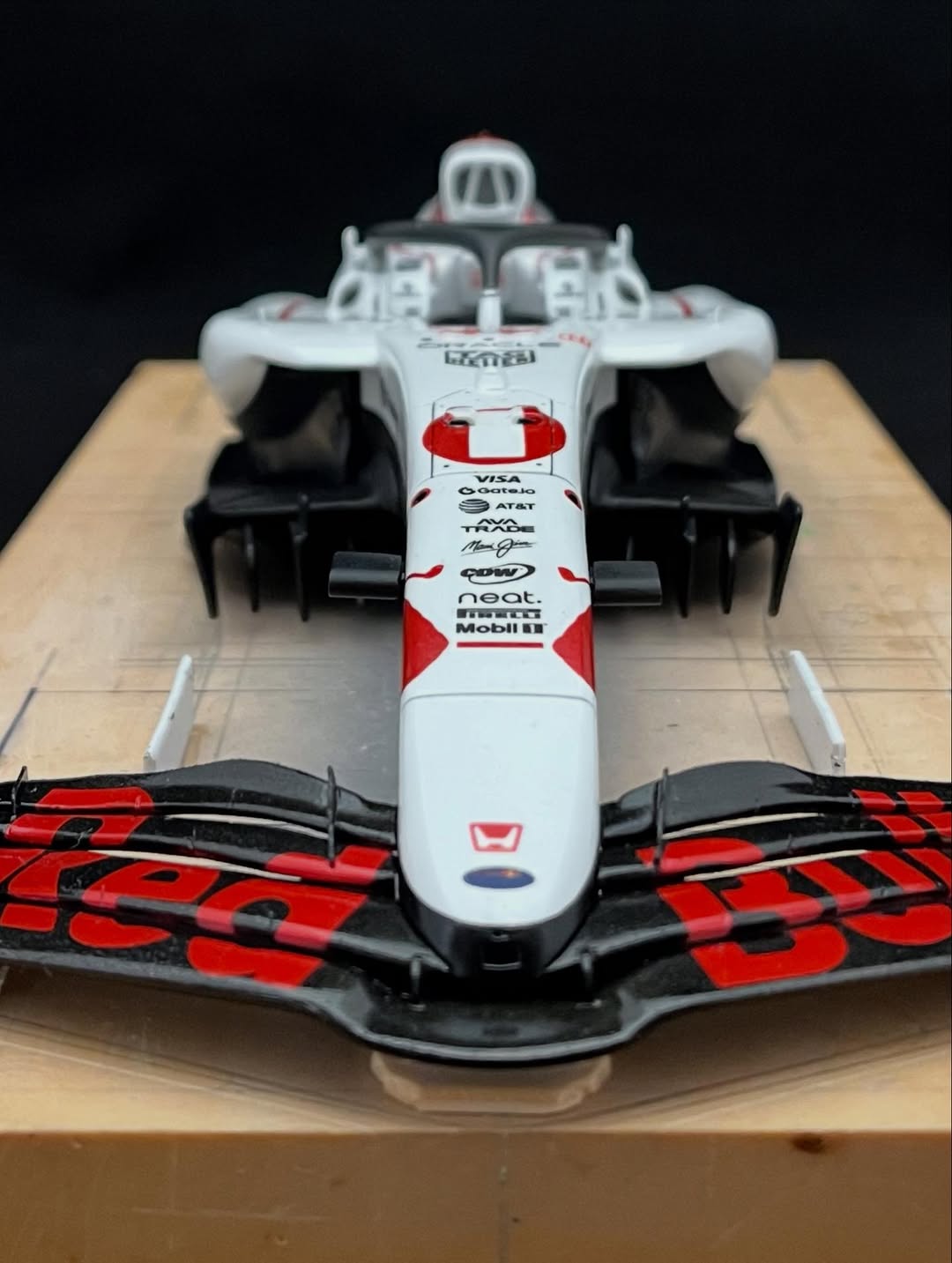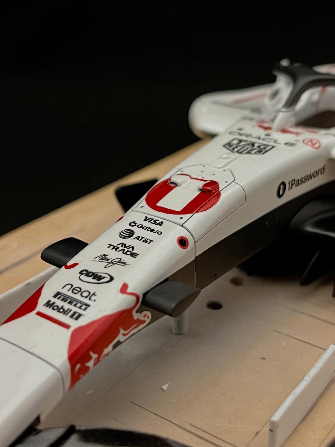 パールレッドが入りました。背中後端の1ゼッケンがまだですが、今回の最難関が出来ました。この赤の為にカッティングマシンを買ったので、沢山失敗してやっと使える様になりました。当初、角田かマックスどちらで製作しようか、考えながら進めましたが角田22ゼッケンをコックピット前の二箇所のダクト上に貼るのがどうしても出来ず、ゼッケン1にしました。