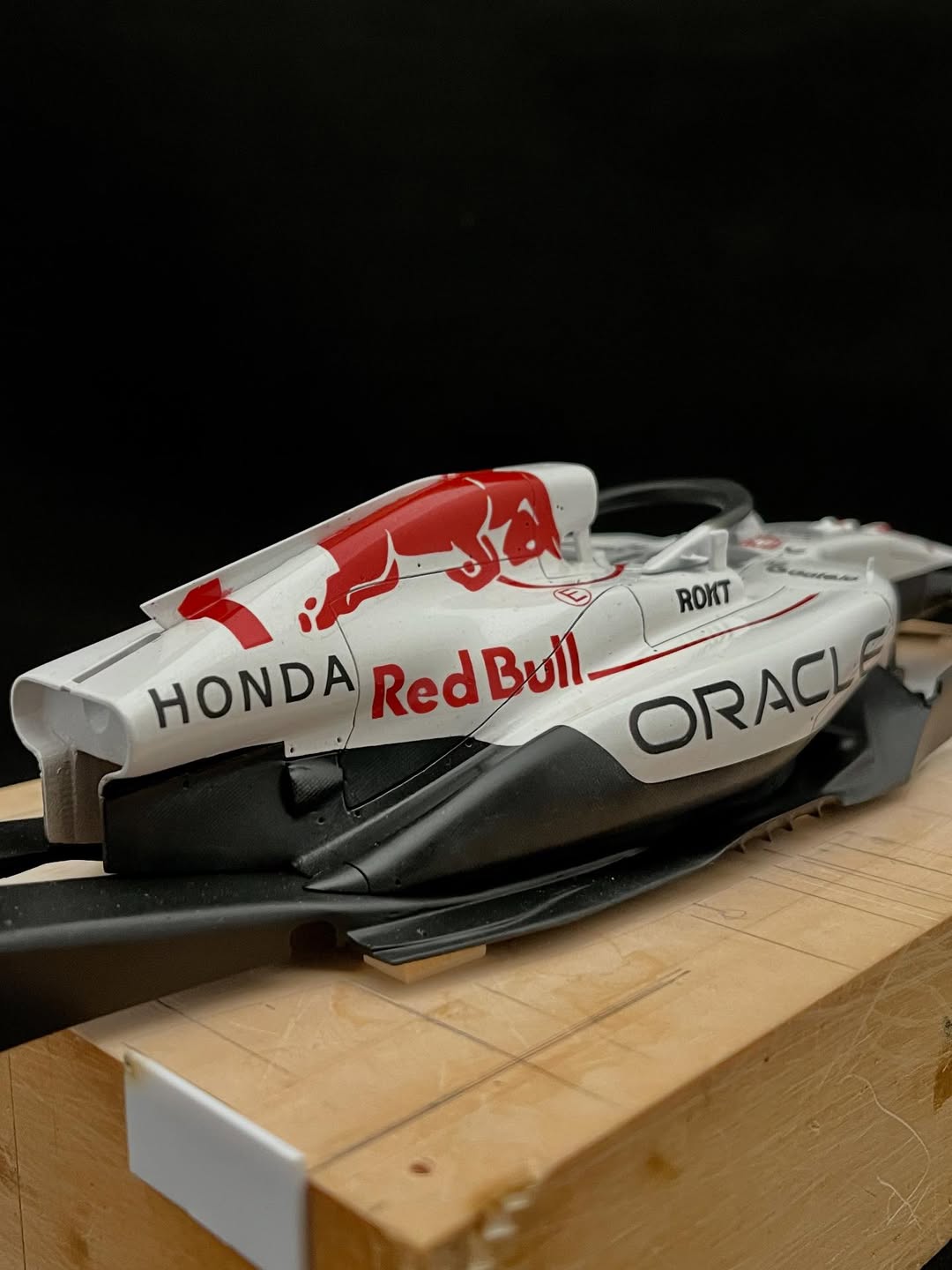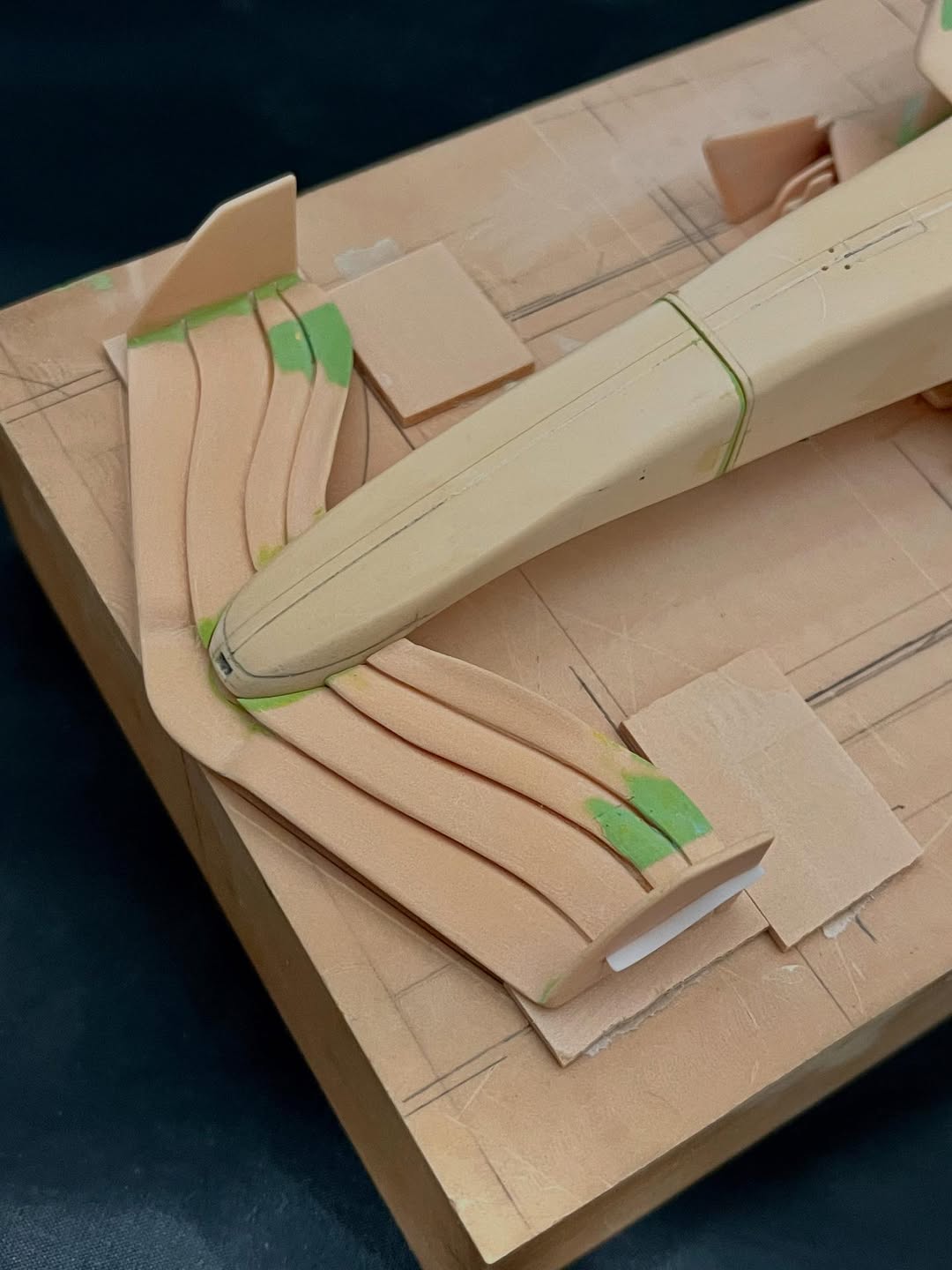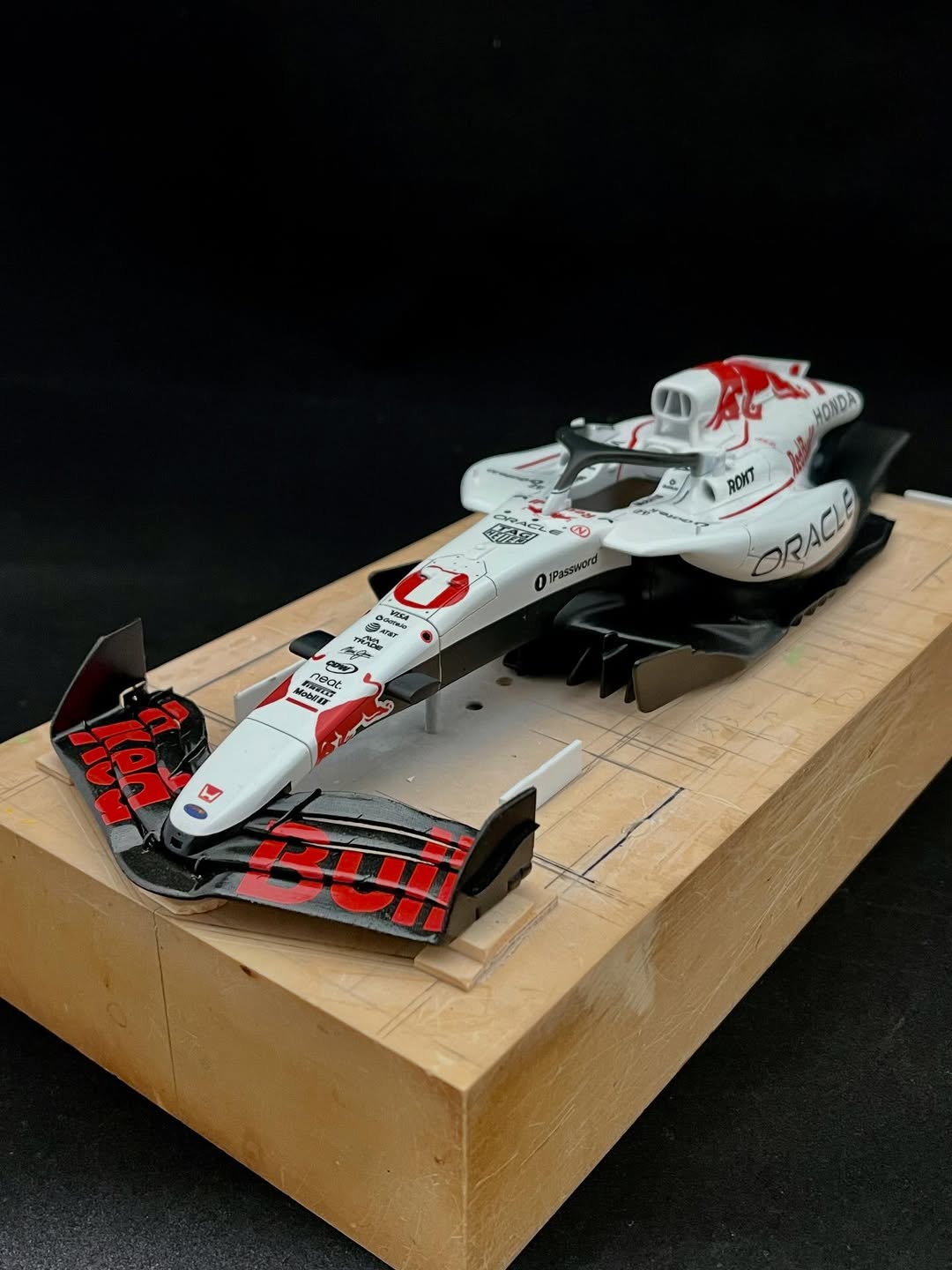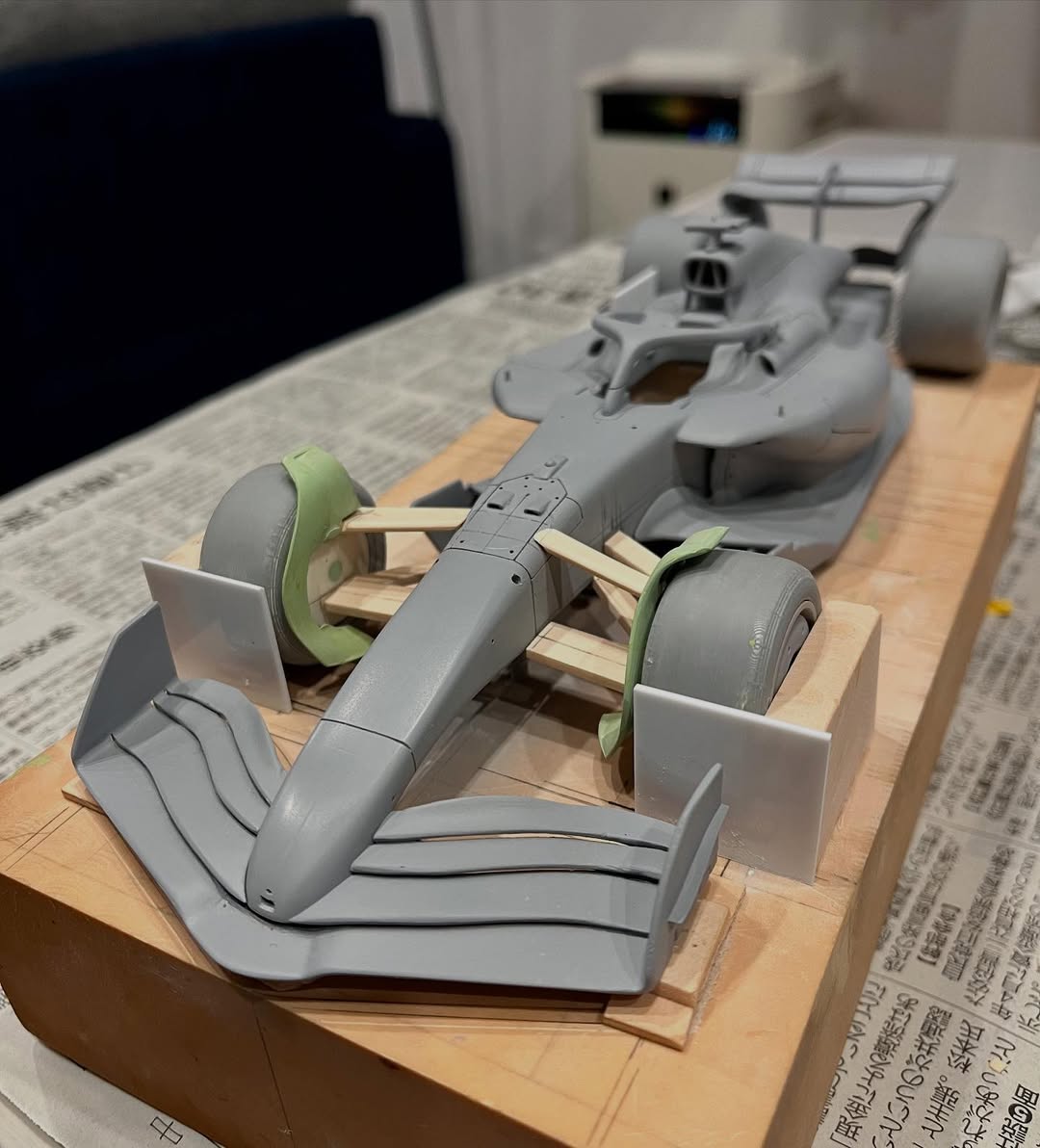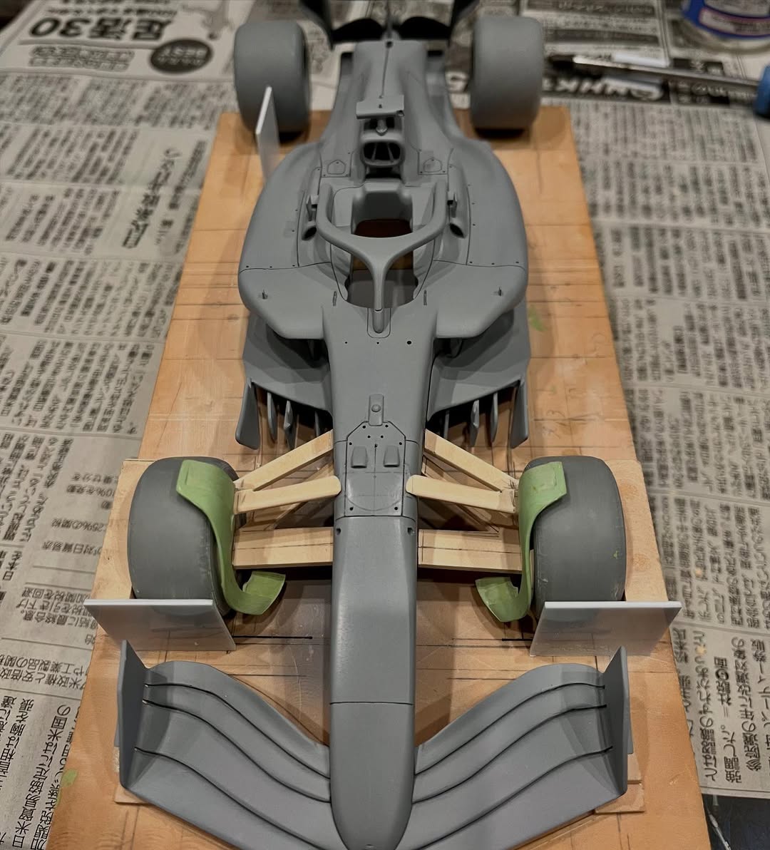 今年は何を製作しようか検討してましたが、鈴鹿で見たレッドブルRB21白牛を製作する事にしました。おそらくガレージキットメーカーさんから3Dキットが発売される事間違い無しですが、それはそれでアナログ製作でどこまで近づけるかチャレンジしてみます。まずはケミカルウッドを角出しして台座に固定します。その後、いつもの事ですけどノーズから形にしていきます。良さそうな画像から大きさとラインを描き、プラ板に写して切り出し、ケミカルウッドにラインを書いて大体の形状を出していきます。