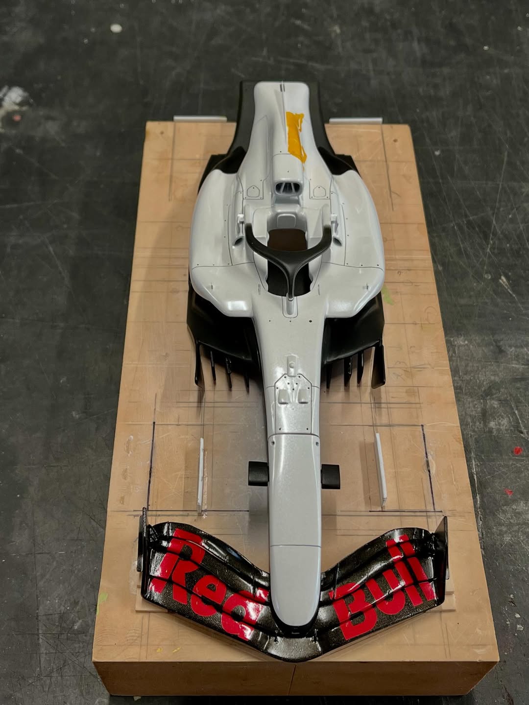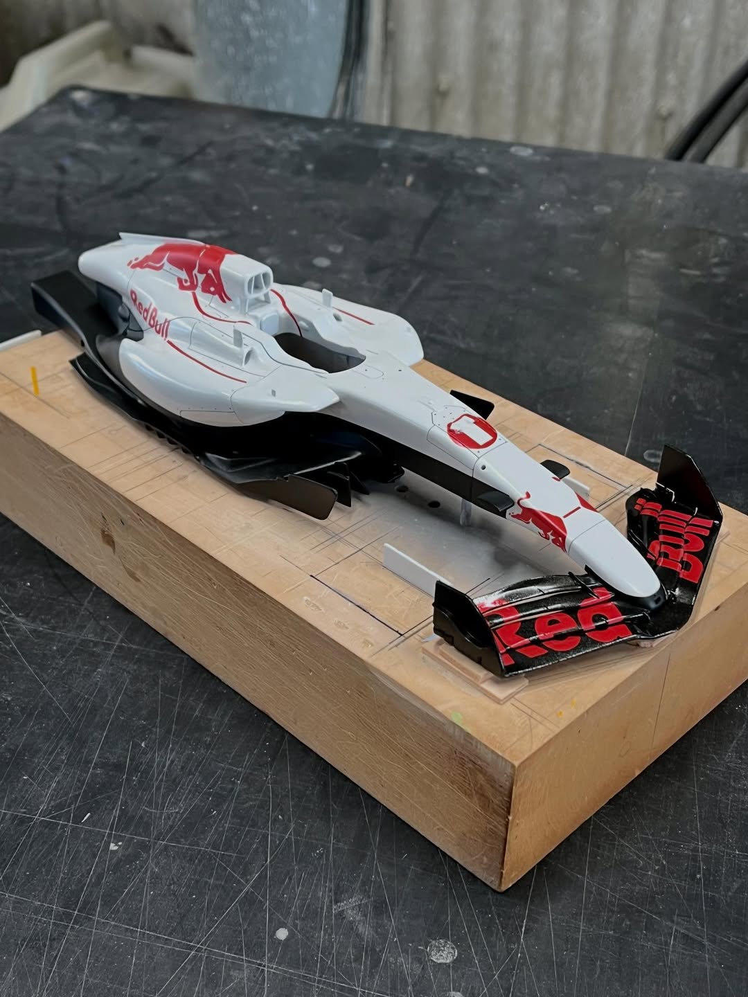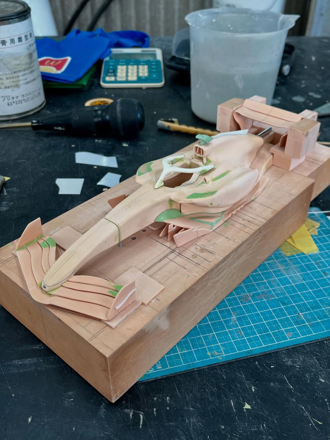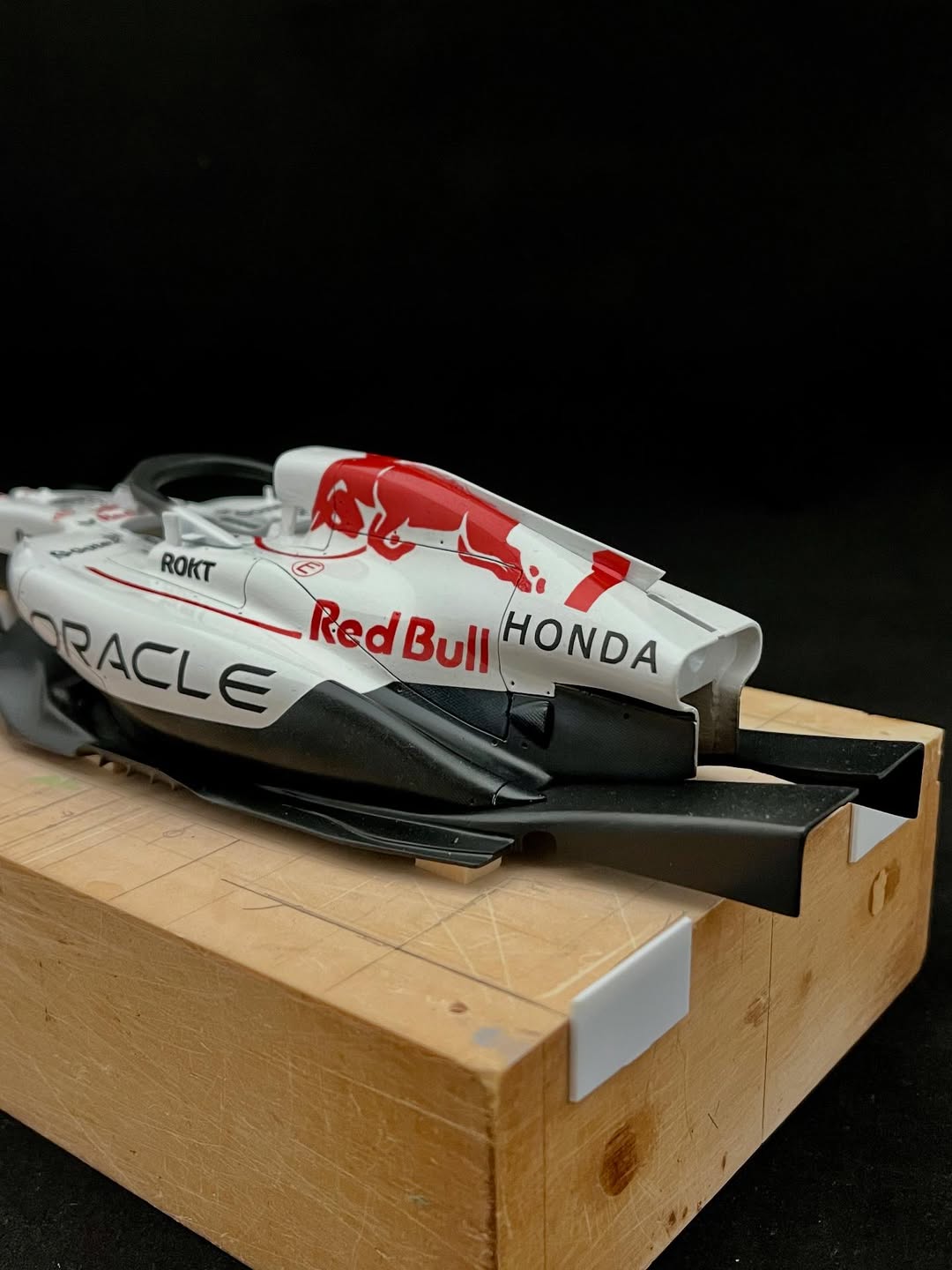 今年は何を製作しようか検討してましたが、鈴鹿で見たレッドブルRB21白牛を製作する事にしました。おそらくガレージキットメーカーさんから3Dキットが発売される事間違い無しですが、それはそれでアナログ製作でどこまで近づけるかチャレンジしてみます。まずはケミカルウッドを角出しして台座に固定します。その後、いつもの事ですけどノーズから形にしていきます。良さそうな画像から大きさとラインを描き、プラ板に写して切り出し、ケミカルウッドにラインを書いて大体の形状を出していきます。