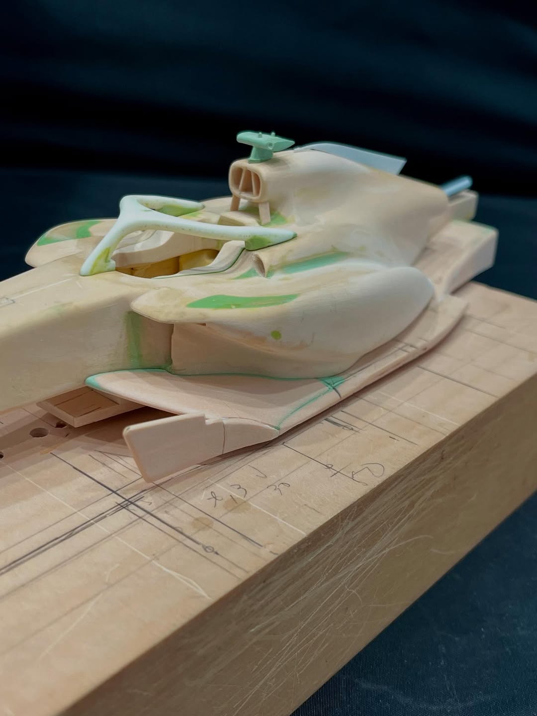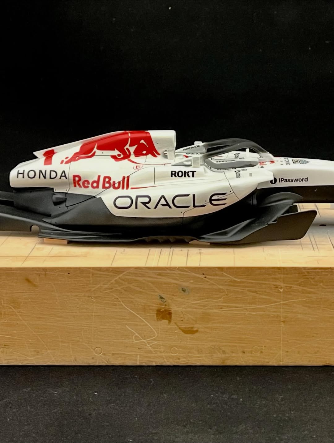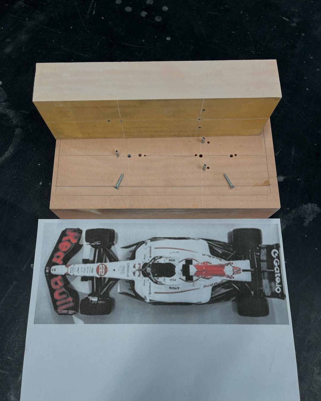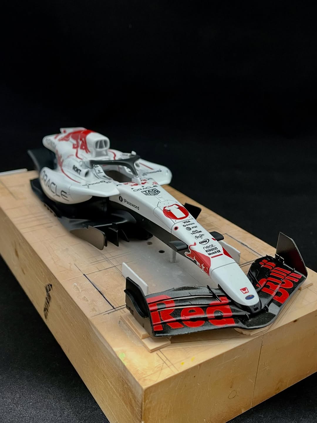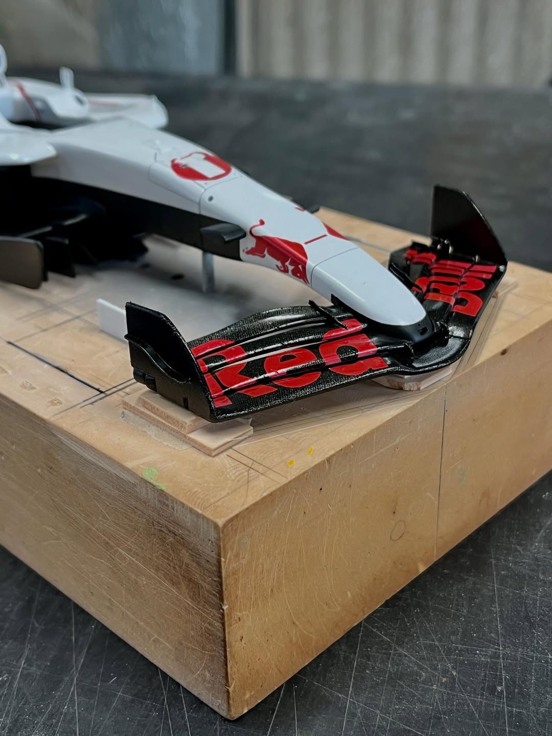 今年は何を製作しようか検討してましたが、鈴鹿で見たレッドブルRB21白牛を製作する事にしました。おそらくガレージキットメーカーさんから3Dキットが発売される事間違い無しですが、それはそれでアナログ製作でどこまで近づけるかチャレンジしてみます。まずはケミカルウッドを角出しして台座に固定します。その後、いつもの事ですけどノーズから形にしていきます。良さそうな画像から大きさとラインを描き、プラ板に写して切り出し、ケミカルウッドにラインを書いて大体の形状を出していきます。