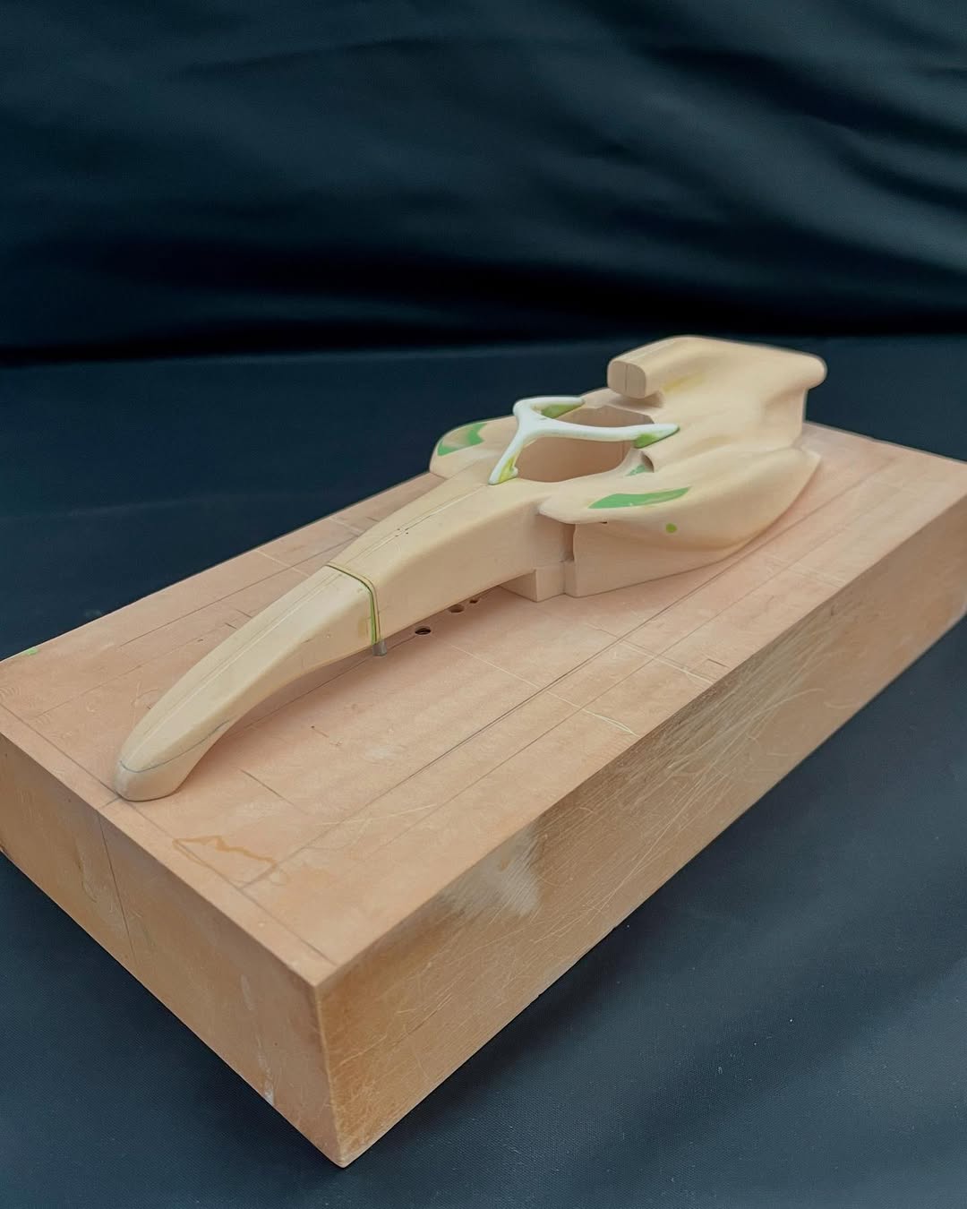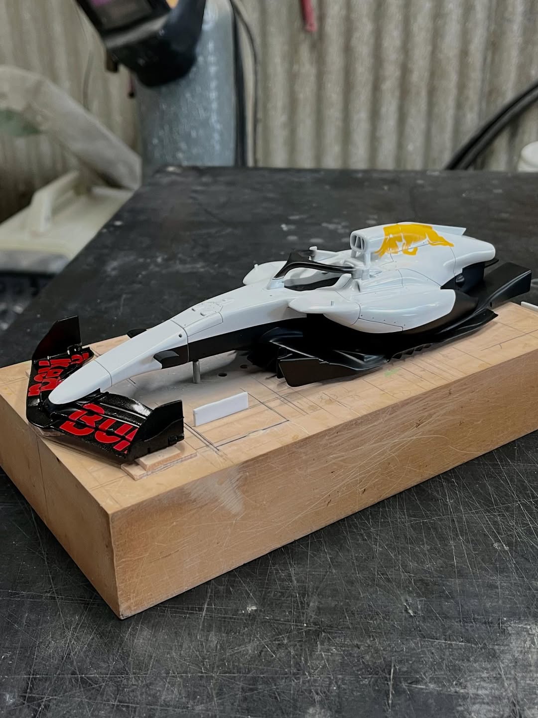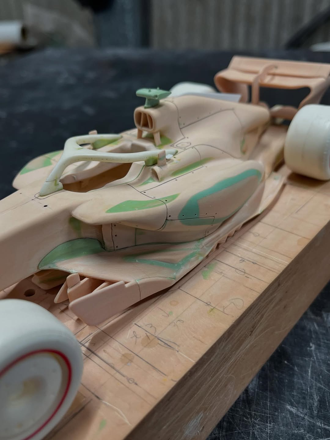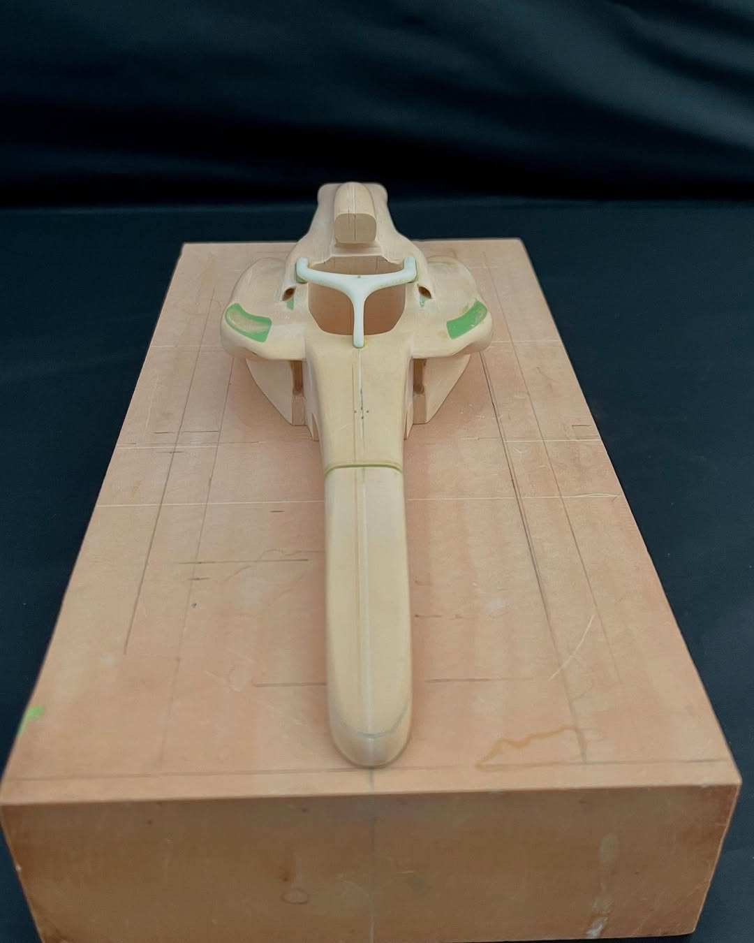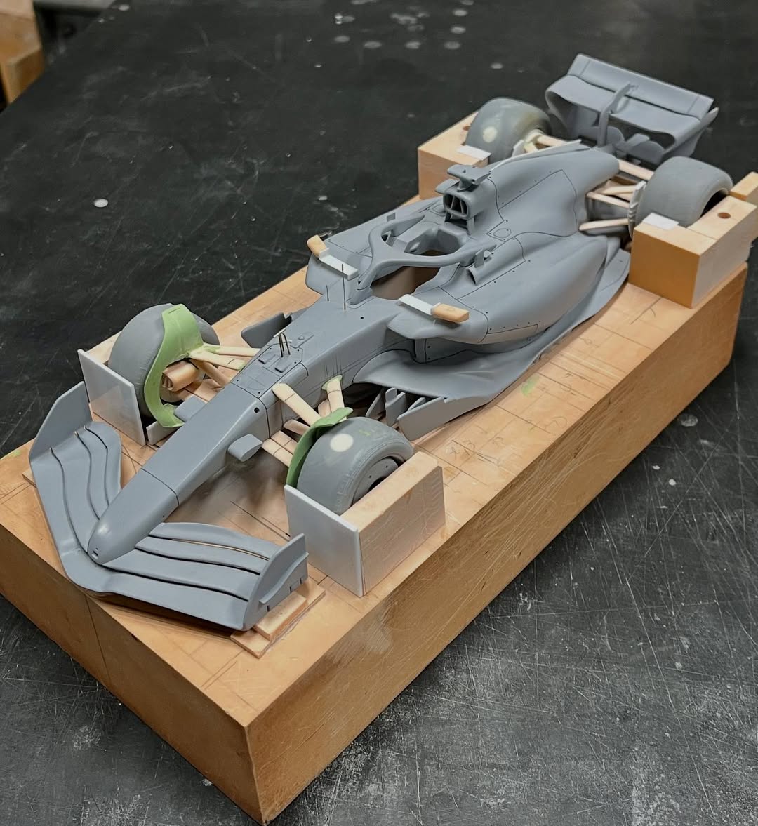 今年は何を製作しようか検討してましたが、鈴鹿で見たレッドブルRB21白牛を製作する事にしました。おそらくガレージキットメーカーさんから3Dキットが発売される事間違い無しですが、それはそれでアナログ製作でどこまで近づけるかチャレンジしてみます。まずはケミカルウッドを角出しして台座に固定します。その後、いつもの事ですけどノーズから形にしていきます。良さそうな画像から大きさとラインを描き、プラ板に写して切り出し、ケミカルウッドにラインを書いて大体の形状を出していきます。