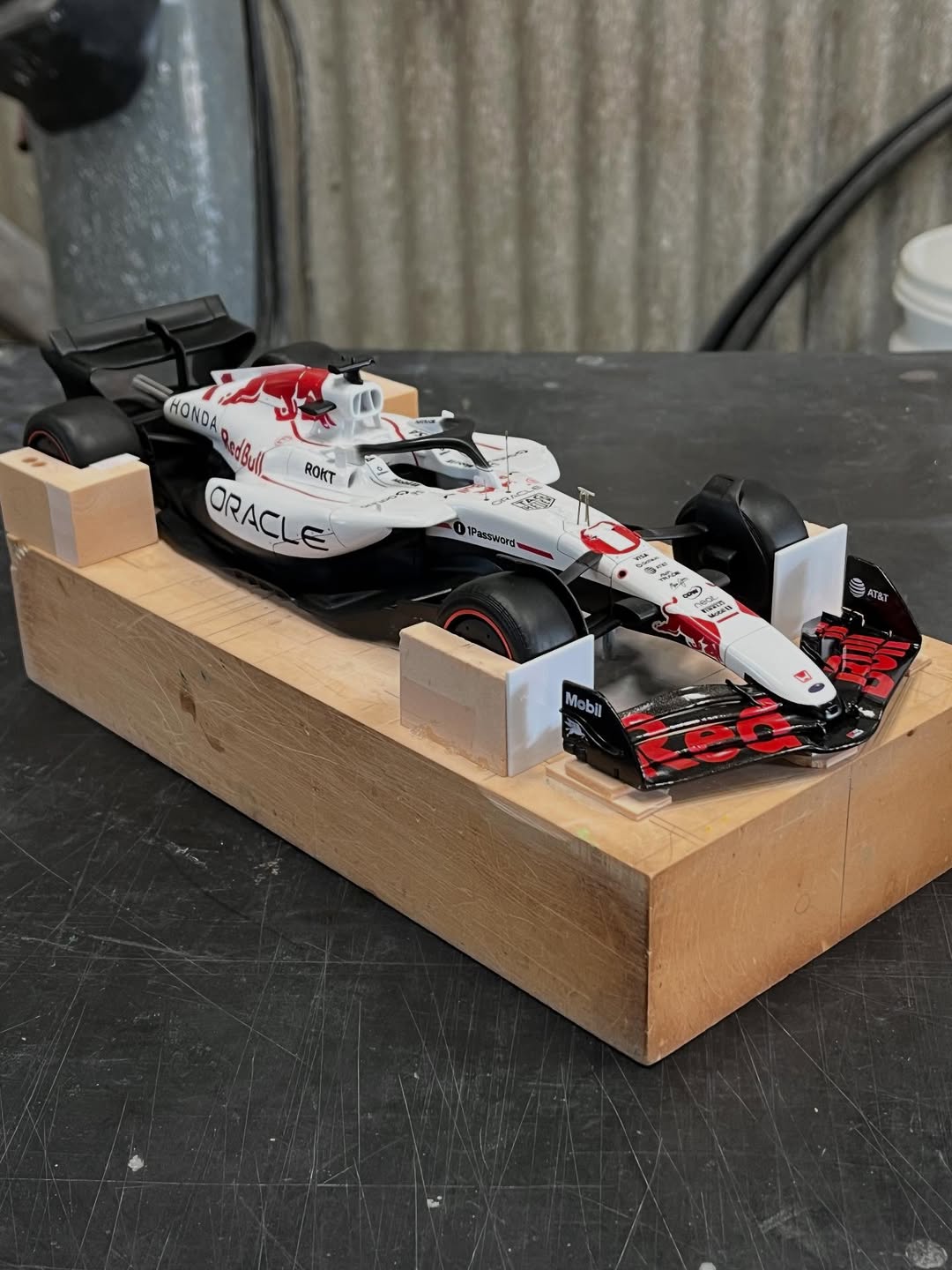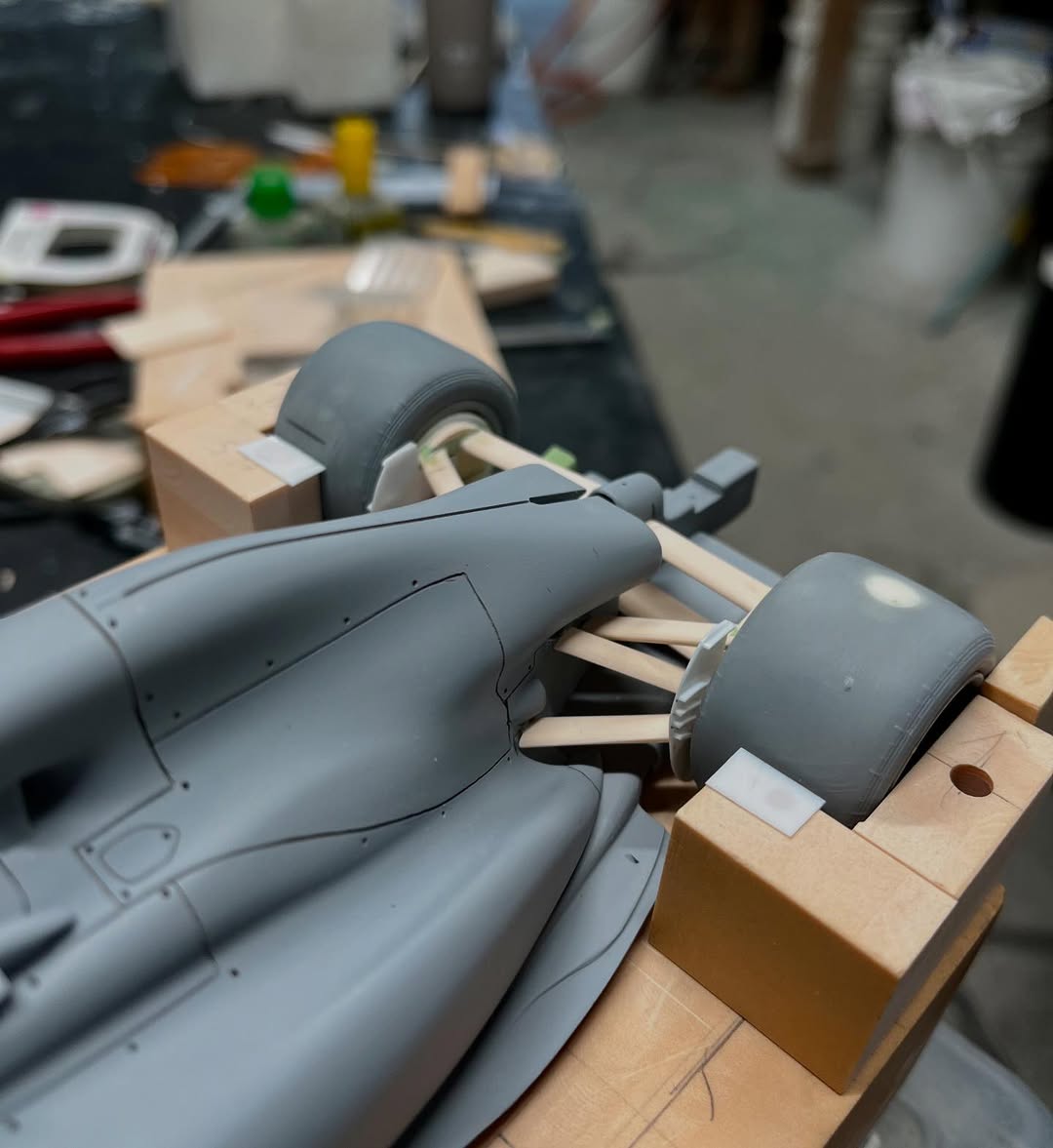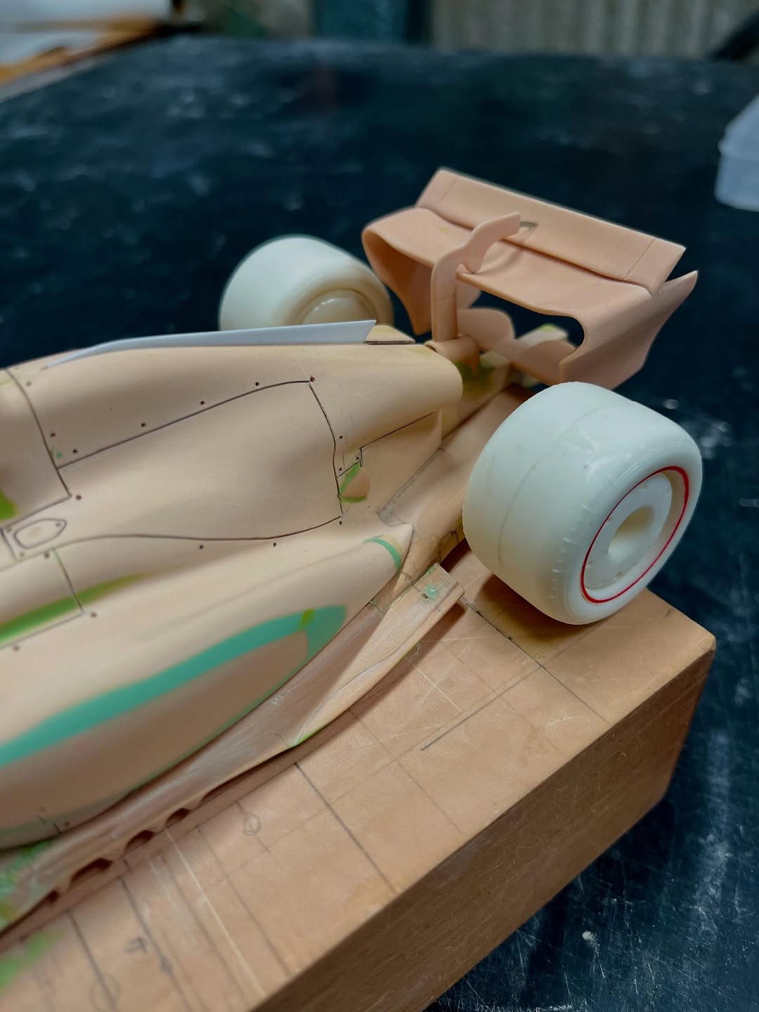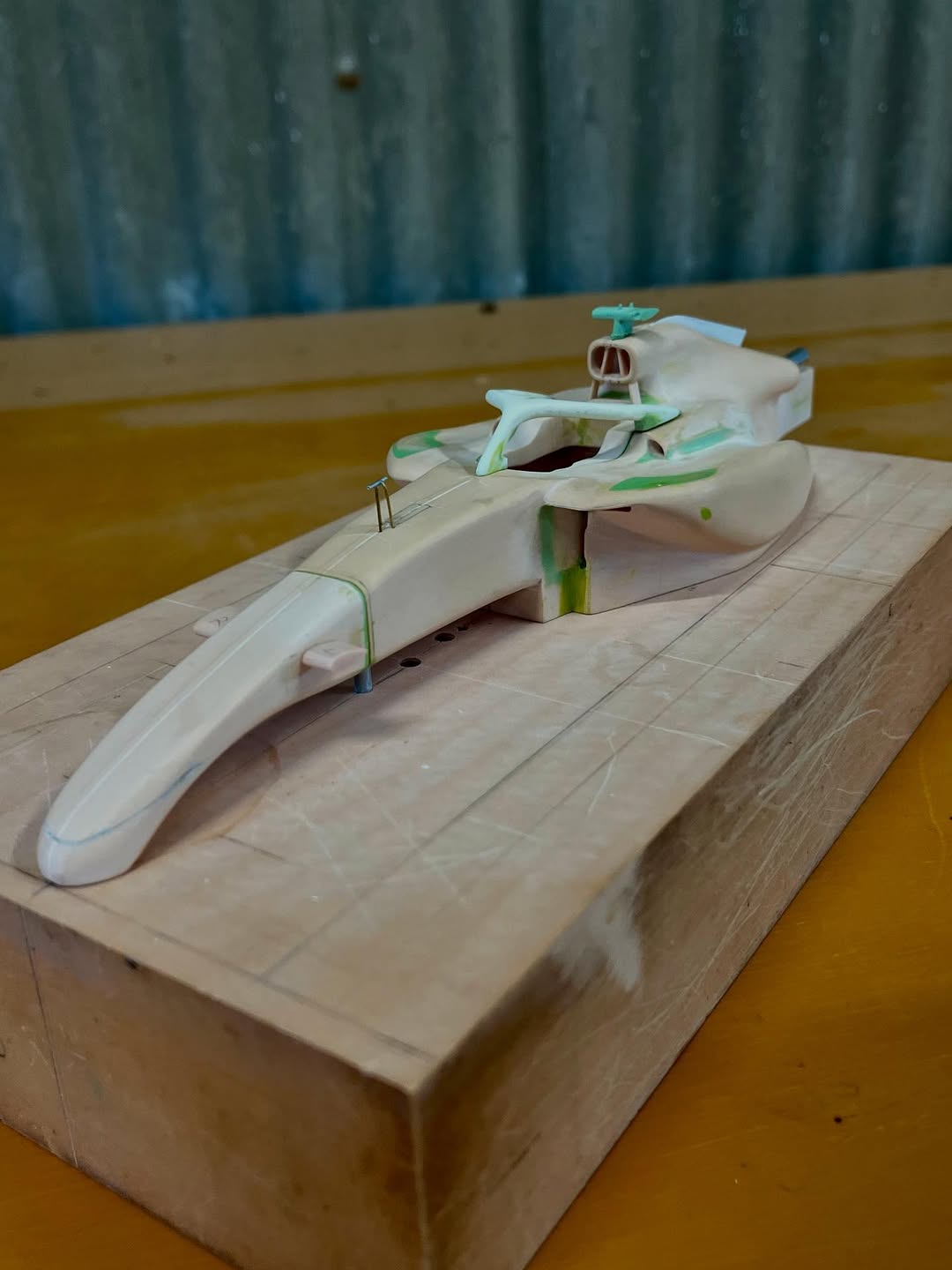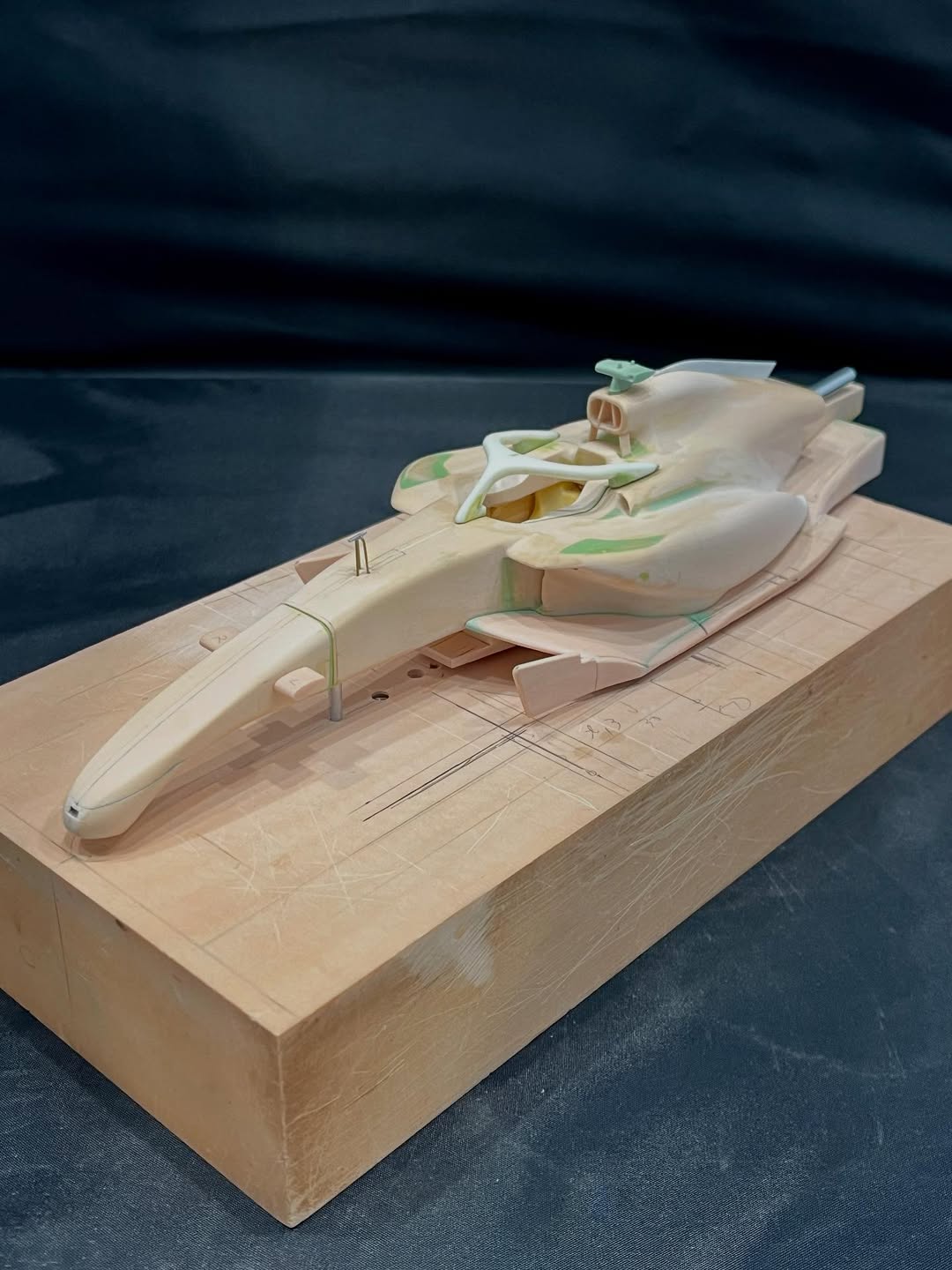 今年は何を製作しようか検討してましたが、鈴鹿で見たレッドブルRB21白牛を製作する事にしました。おそらくガレージキットメーカーさんから3Dキットが発売される事間違い無しですが、それはそれでアナログ製作でどこまで近づけるかチャレンジしてみます。まずはケミカルウッドを角出しして台座に固定します。その後、いつもの事ですけどノーズから形にしていきます。良さそうな画像から大きさとラインを描き、プラ板に写して切り出し、ケミカルウッドにラインを書いて大体の形状を出していきます。