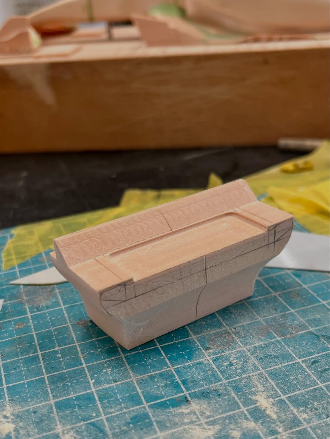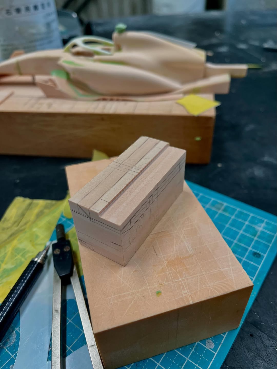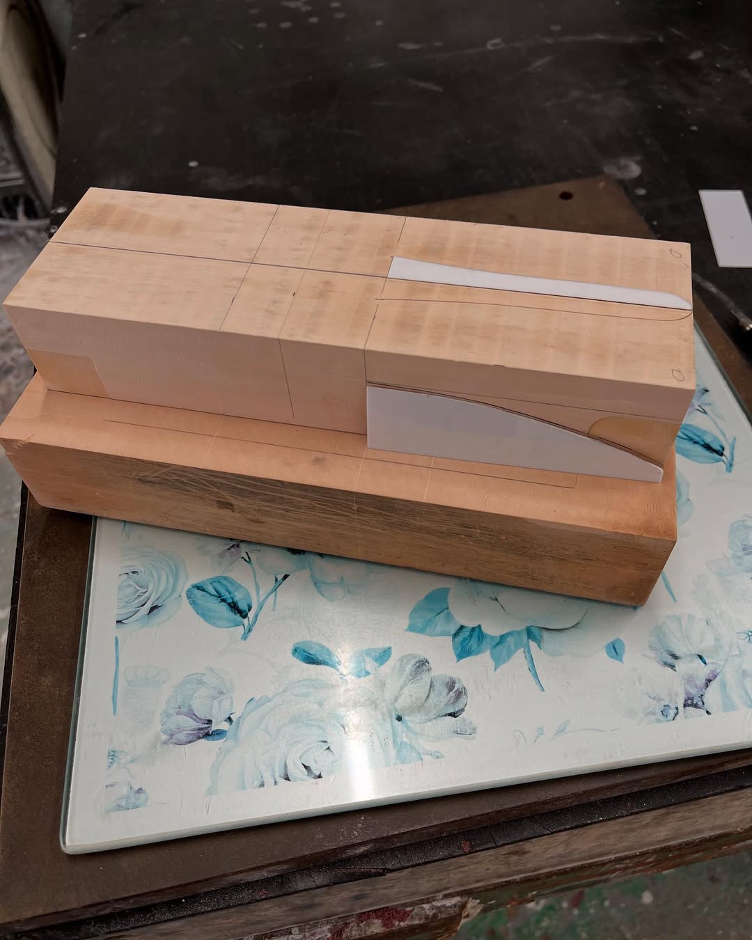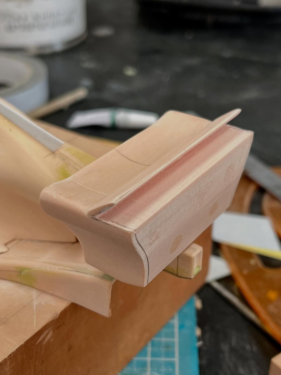 今年は何を製作しようか検討してましたが、鈴鹿で見たレッドブルRB21白牛を製作する事にしました。おそらくガレージキットメーカーさんから3Dキットが発売される事間違い無しですが、それはそれでアナログ製作でどこまで近づけるかチャレンジしてみます。まずはケミカルウッドを角出しして台座に固定します。その後、いつもの事ですけどノーズから形にしていきます。良さそうな画像から大きさとラインを描き、プラ板に写して切り出し、ケミカルウッドにラインを書いて大体の形状を出していきます。