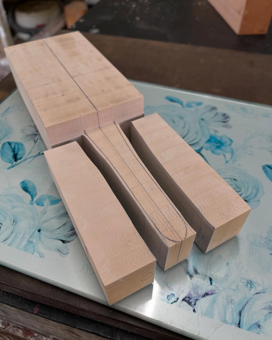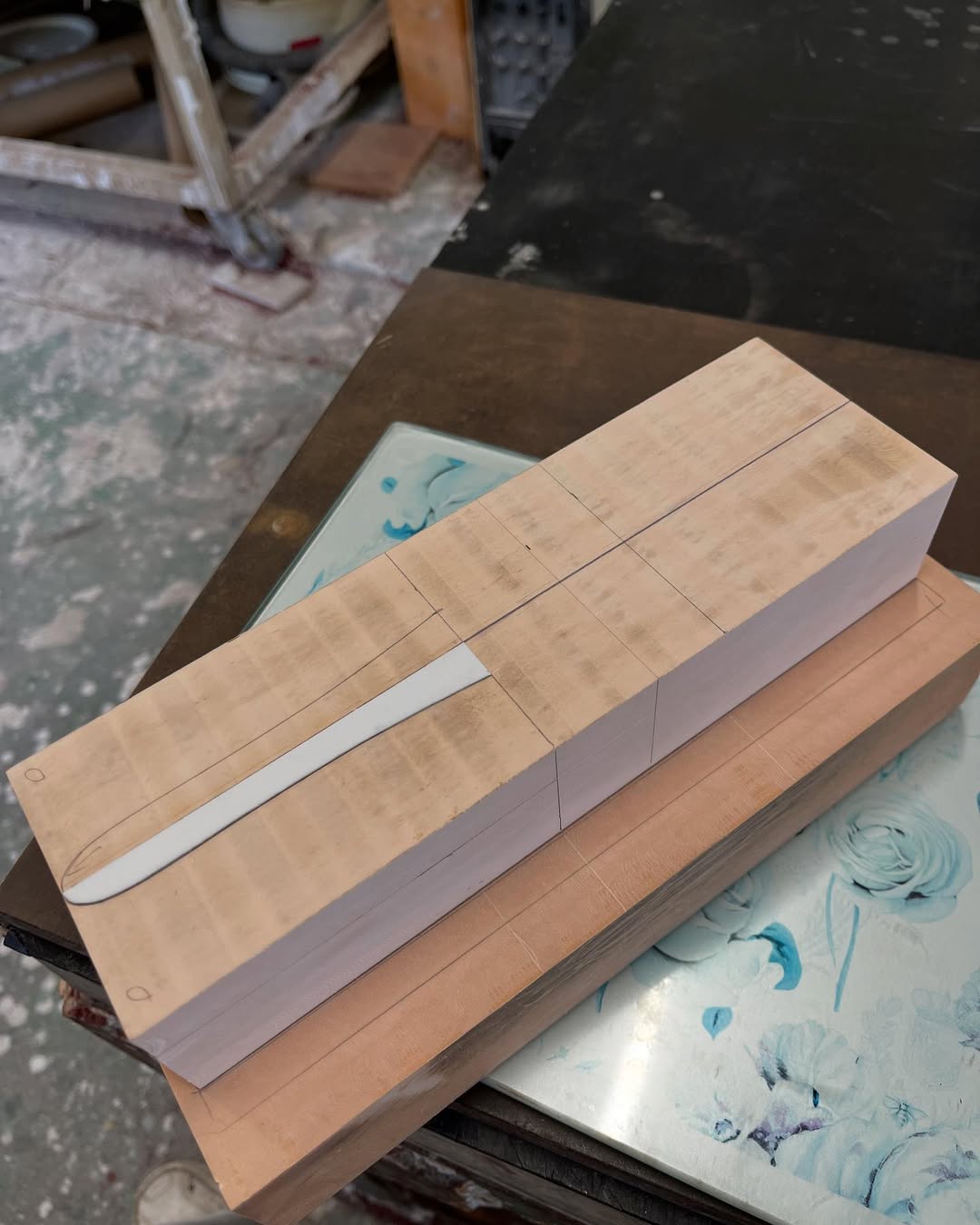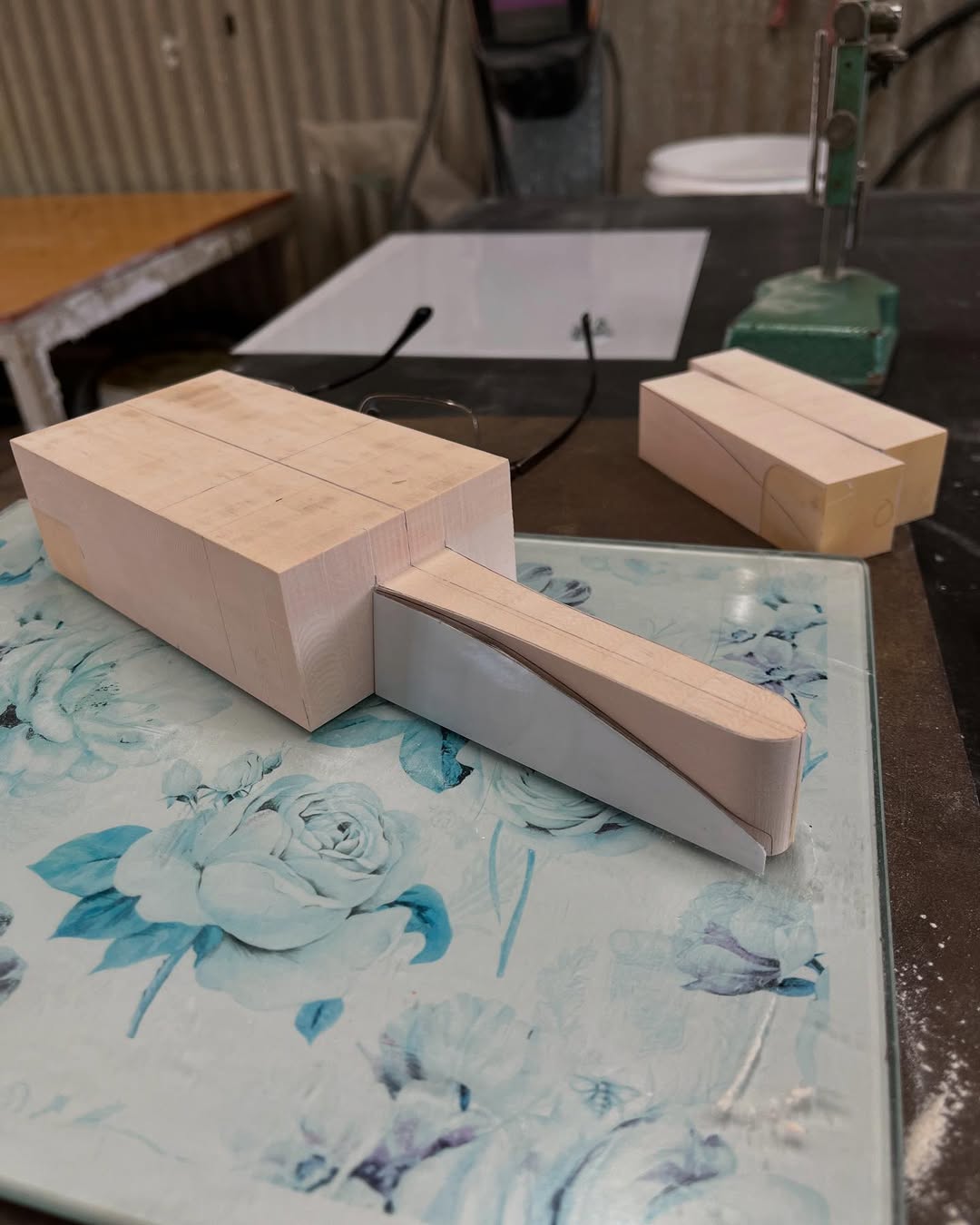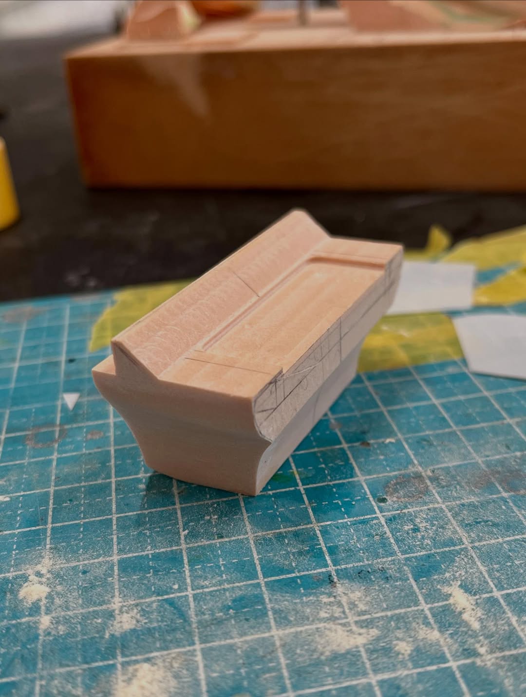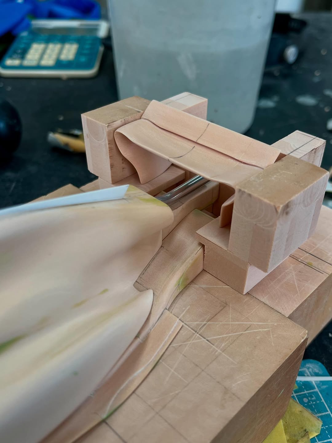 今年は何を製作しようか検討してましたが、鈴鹿で見たレッドブルRB21白牛を製作する事にしました。おそらくガレージキットメーカーさんから3Dキットが発売される事間違い無しですが、それはそれでアナログ製作でどこまで近づけるかチャレンジしてみます。まずはケミカルウッドを角出しして台座に固定します。その後、いつもの事ですけどノーズから形にしていきます。良さそうな画像から大きさとラインを描き、プラ板に写して切り出し、ケミカルウッドにラインを書いて大体の形状を出していきます。