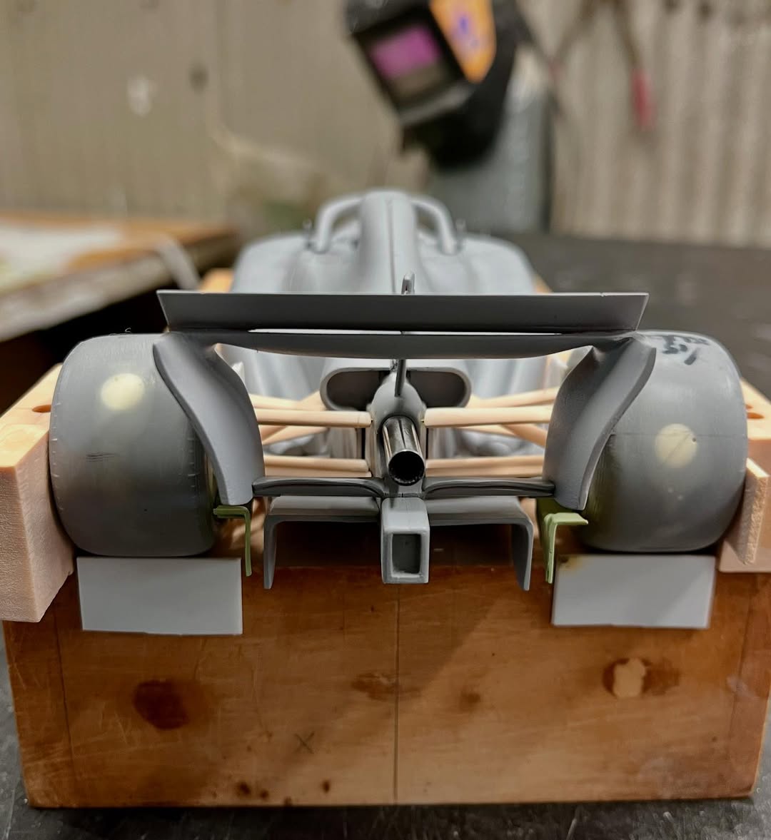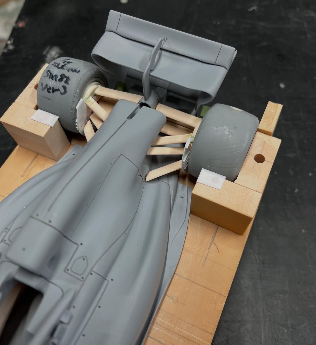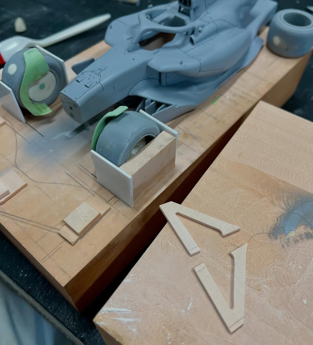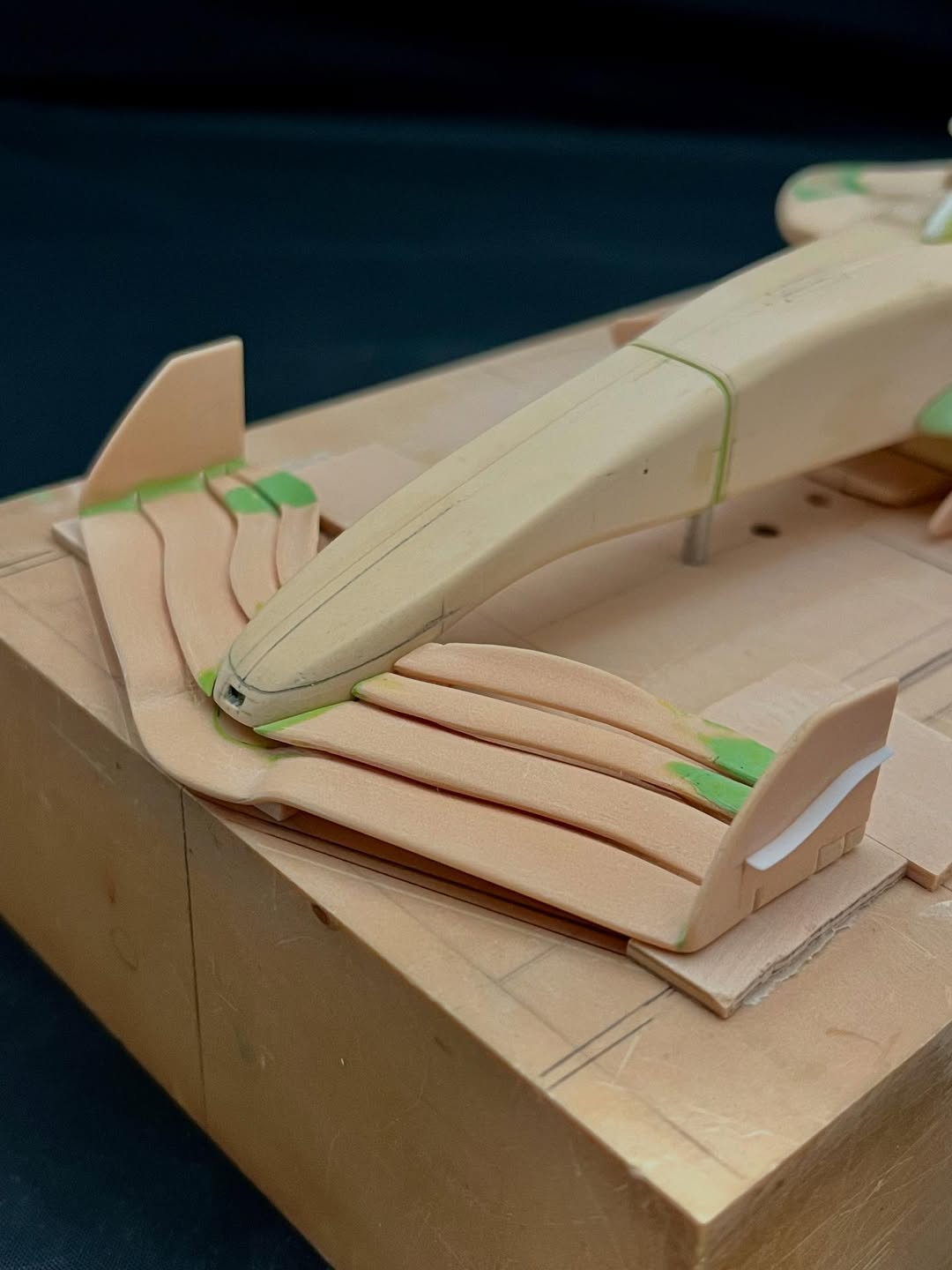 リアウイングの製作です。ここ2年は模型仲間が3Dプリンターで製作した物をそのマシンに合わせて加工してましたが、今回はF1-75以来のケミカルウッドブロックからの削り出しです。寸法の基準にしたい平面が一切ないので、画像を何度も見て頭に入れてから削っていきます。ウイング位置もケミカルウッドブロックでジグを作って保持出来るようにしておきます。