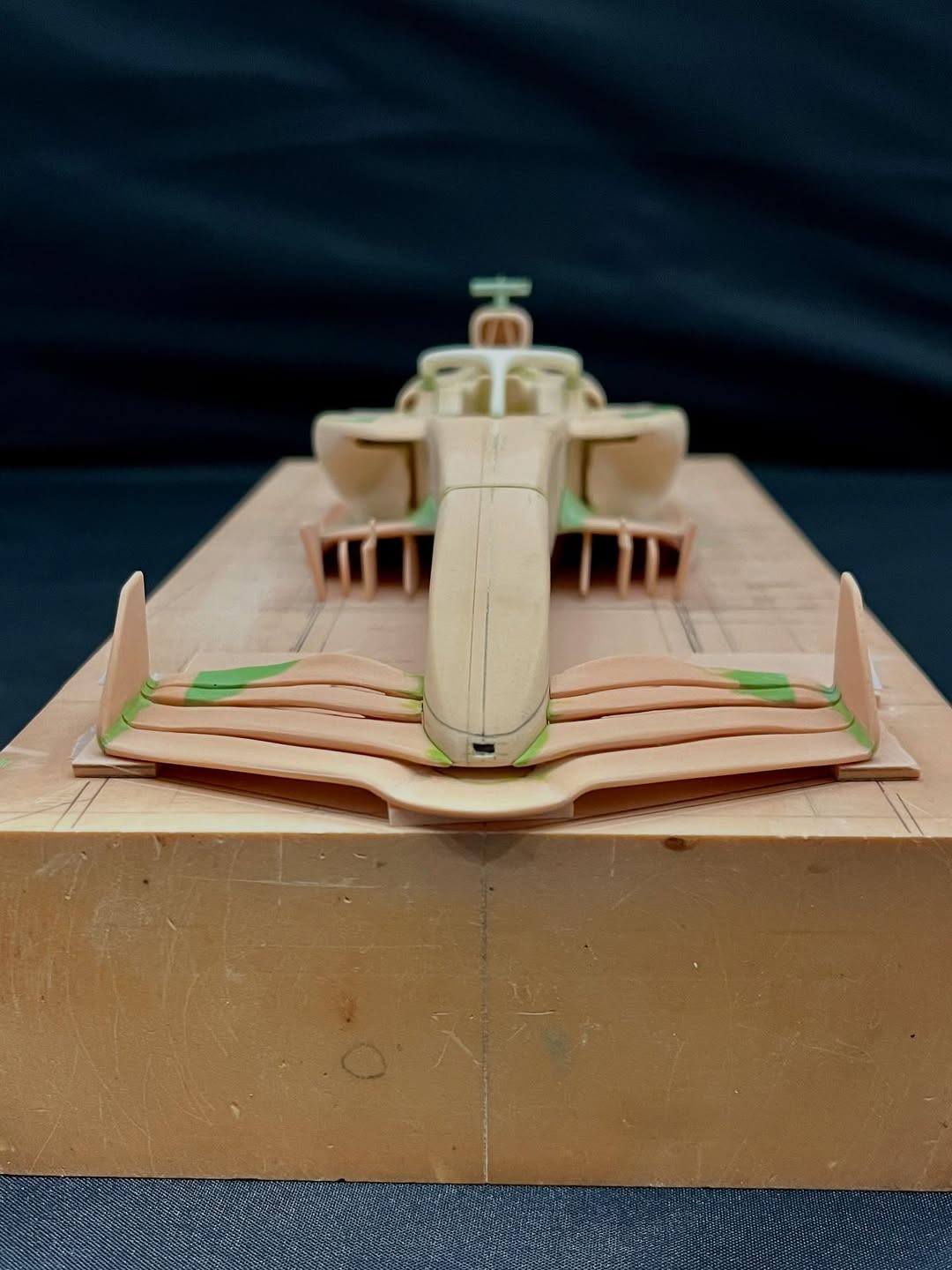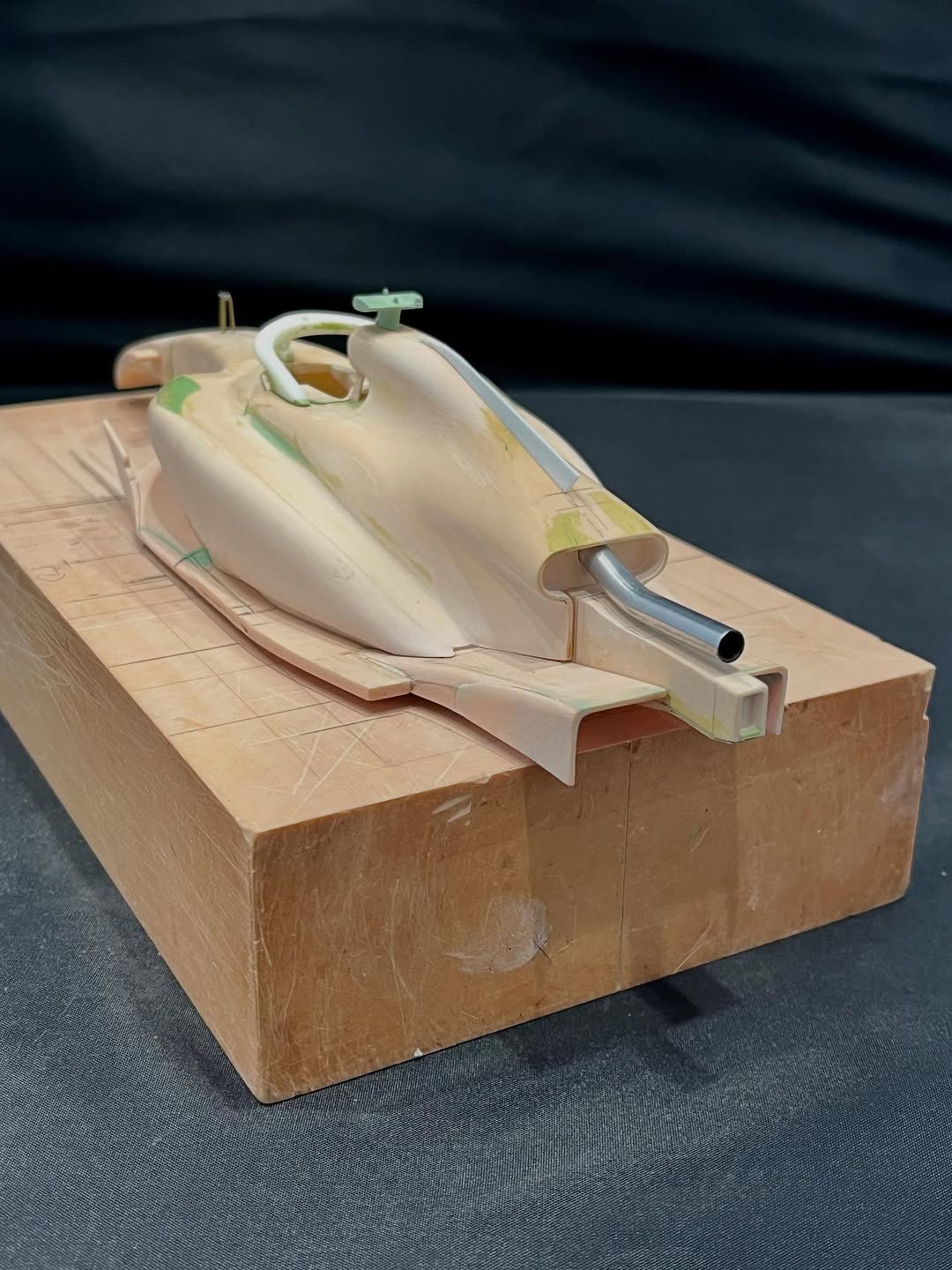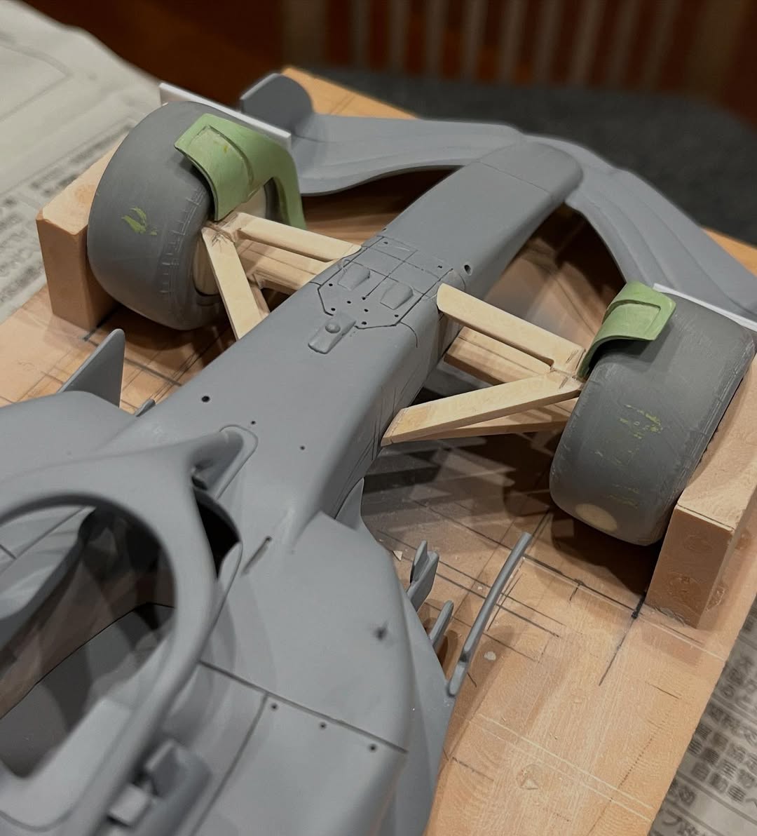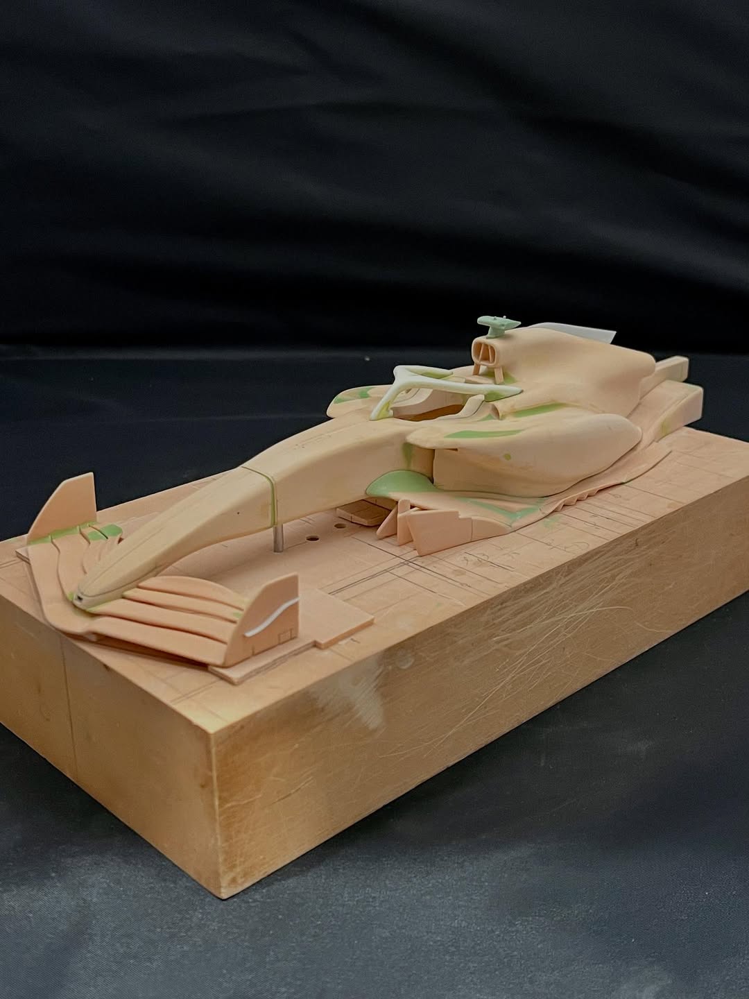 リアウイングの製作です。ここ2年は模型仲間が3Dプリンターで製作した物をそのマシンに合わせて加工してましたが、今回はF1-75以来のケミカルウッドブロックからの削り出しです。寸法の基準にしたい平面が一切ないので、画像を何度も見て頭に入れてから削っていきます。ウイング位置もケミカルウッドブロックでジグを作って保持出来るようにしておきます。