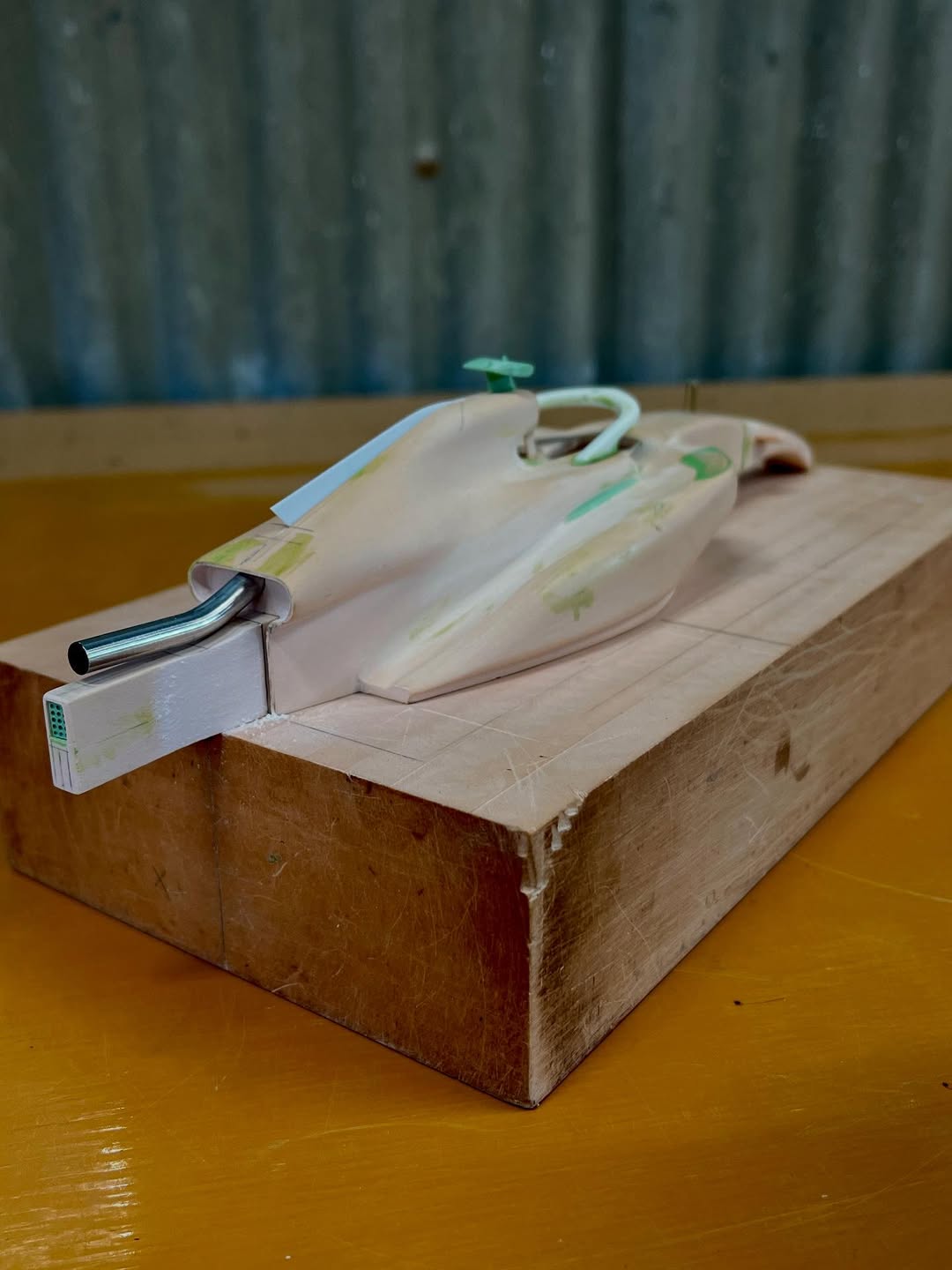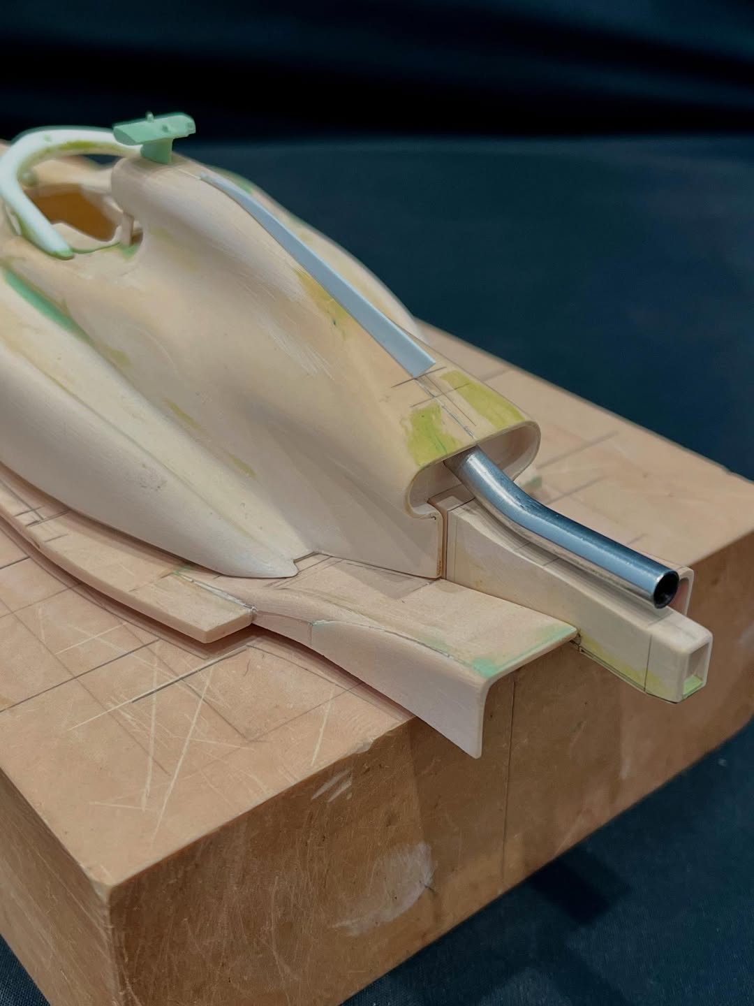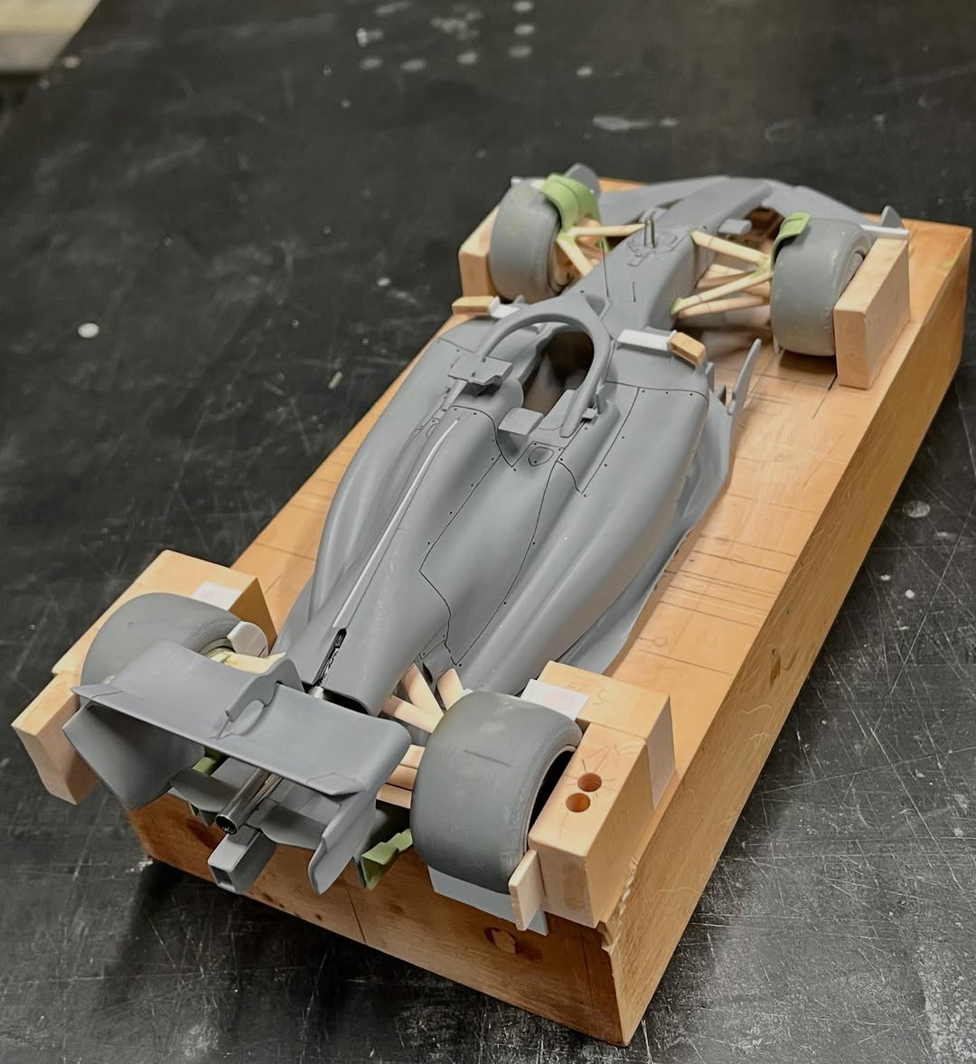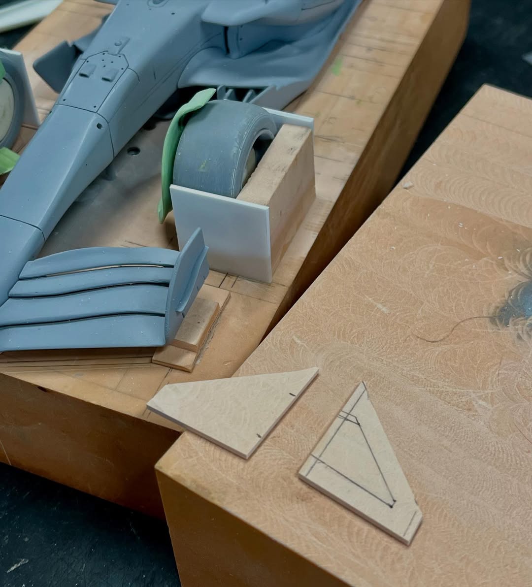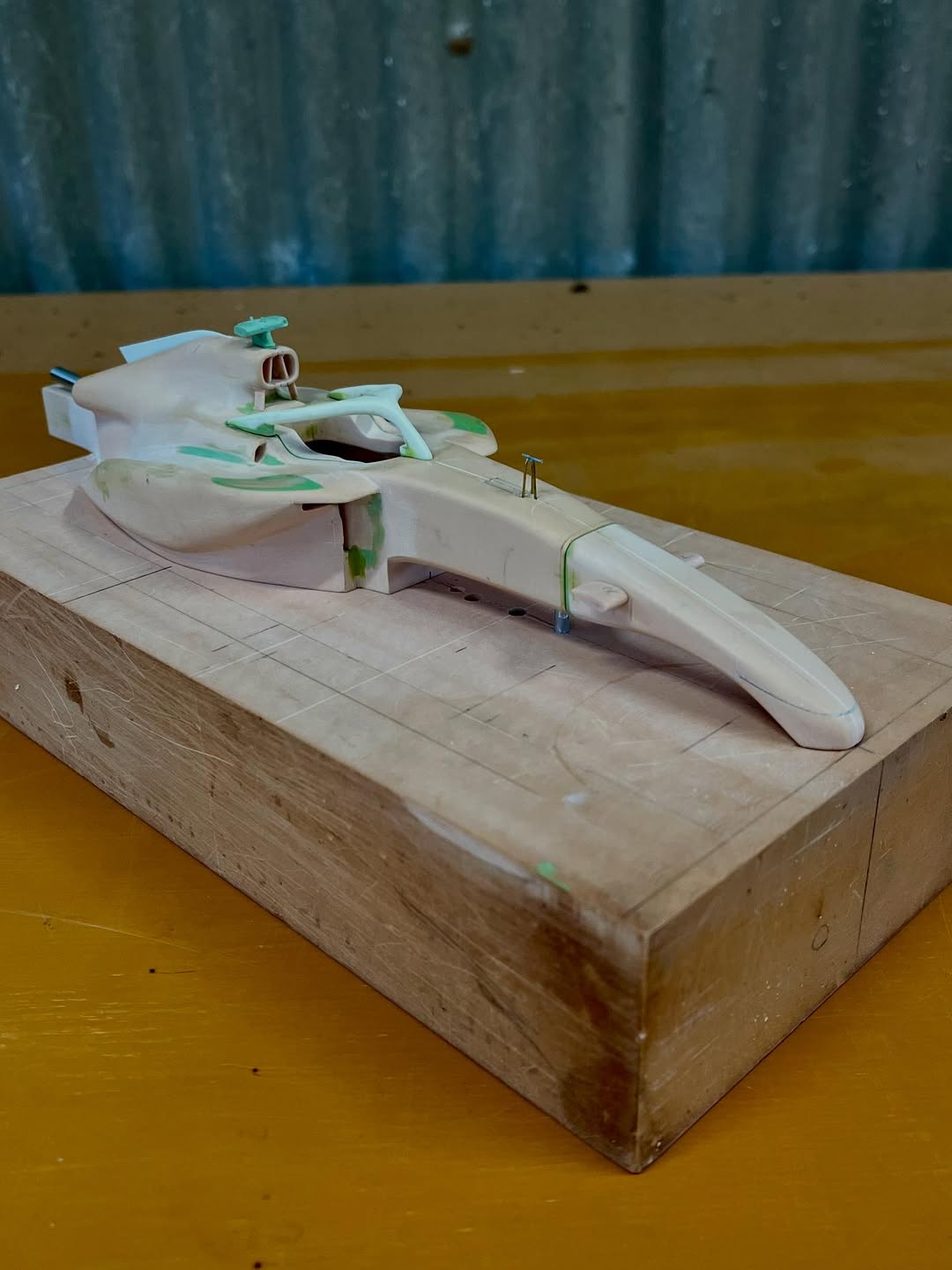 リアウイングの製作です。ここ2年は模型仲間が3Dプリンターで製作した物をそのマシンに合わせて加工してましたが、今回はF1-75以来のケミカルウッドブロックからの削り出しです。寸法の基準にしたい平面が一切ないので、画像を何度も見て頭に入れてから削っていきます。ウイング位置もケミカルウッドブロックでジグを作って保持出来るようにしておきます。