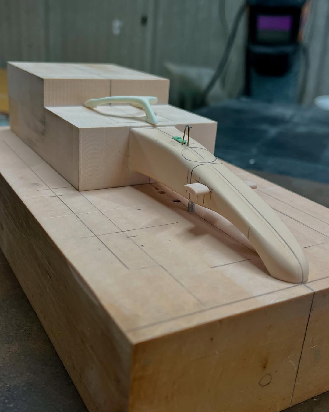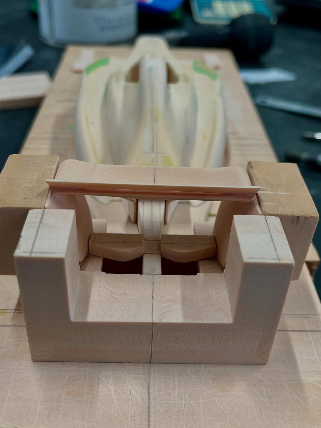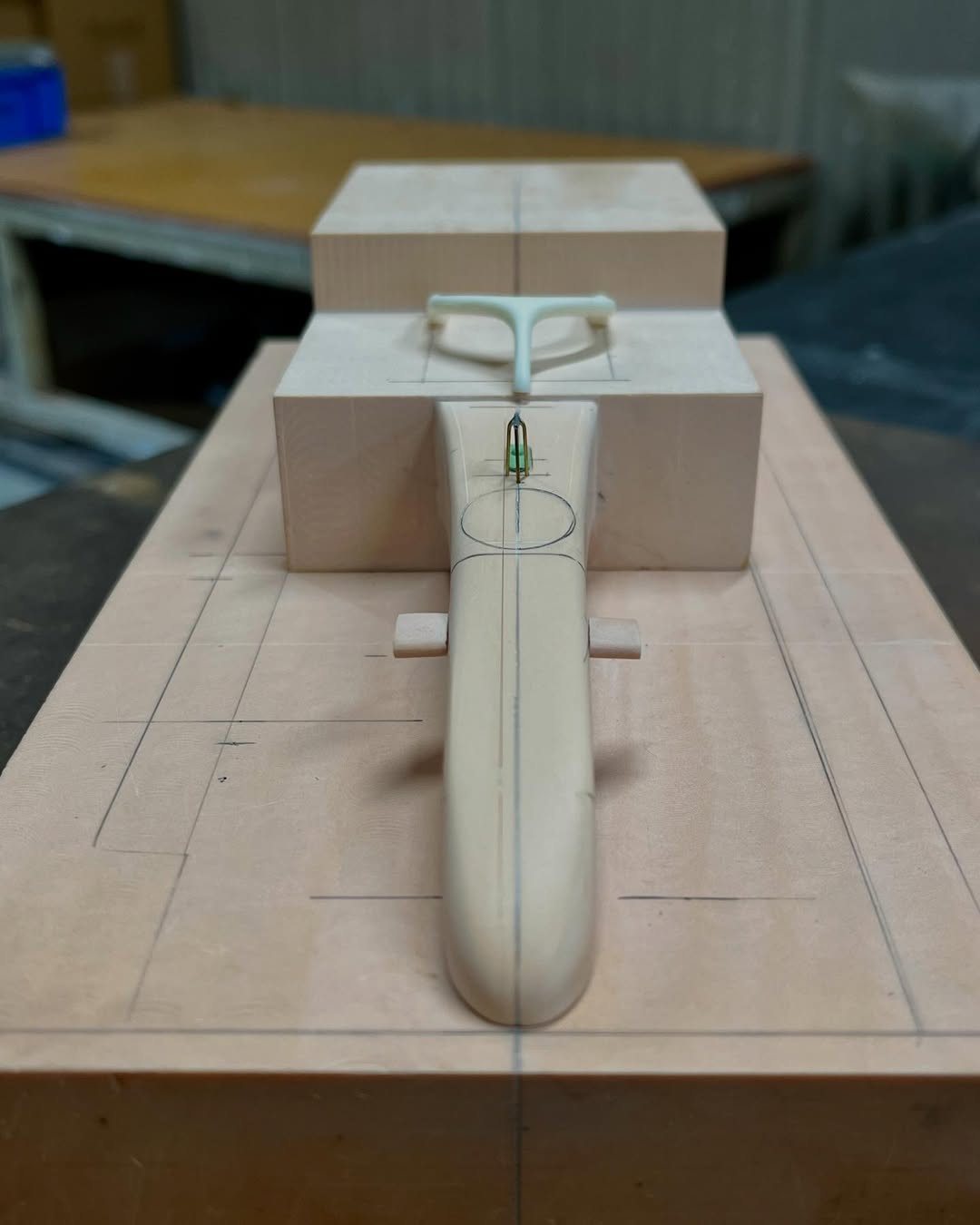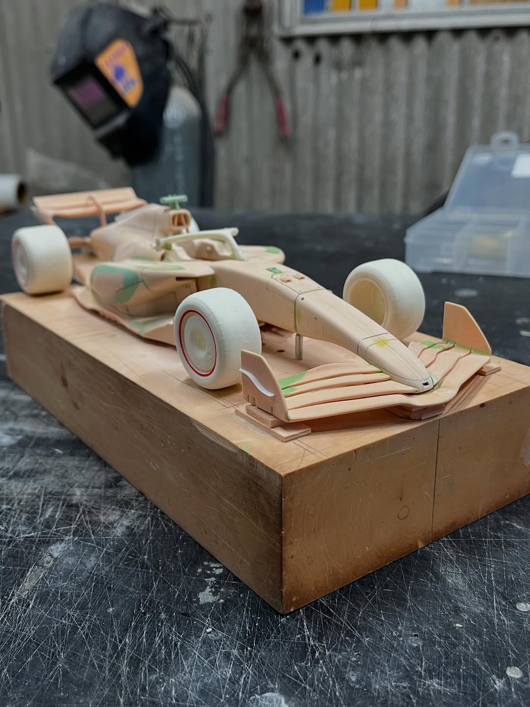リアウイングの製作です。ここ2年は模型仲間が3Dプリンターで製作した物をそのマシンに合わせて加工してましたが、今回はF1-75以来のケミカルウッドブロックからの削り出しです。寸法の基準にしたい平面が一切ないので、画像を何度も見て頭に入れてから削っていきます。ウイング位置もケミカルウッドブロックでジグを作って保持出来るようにしておきます。