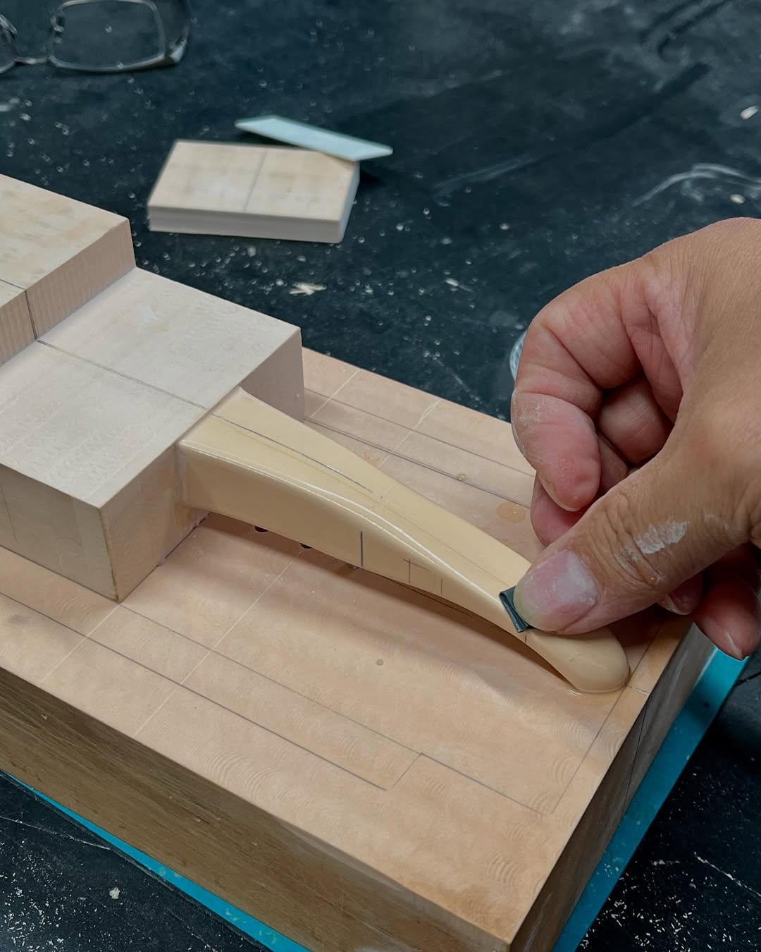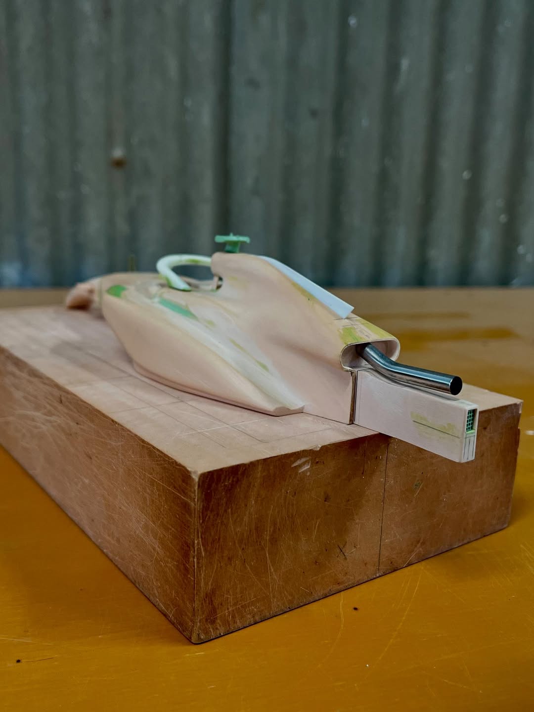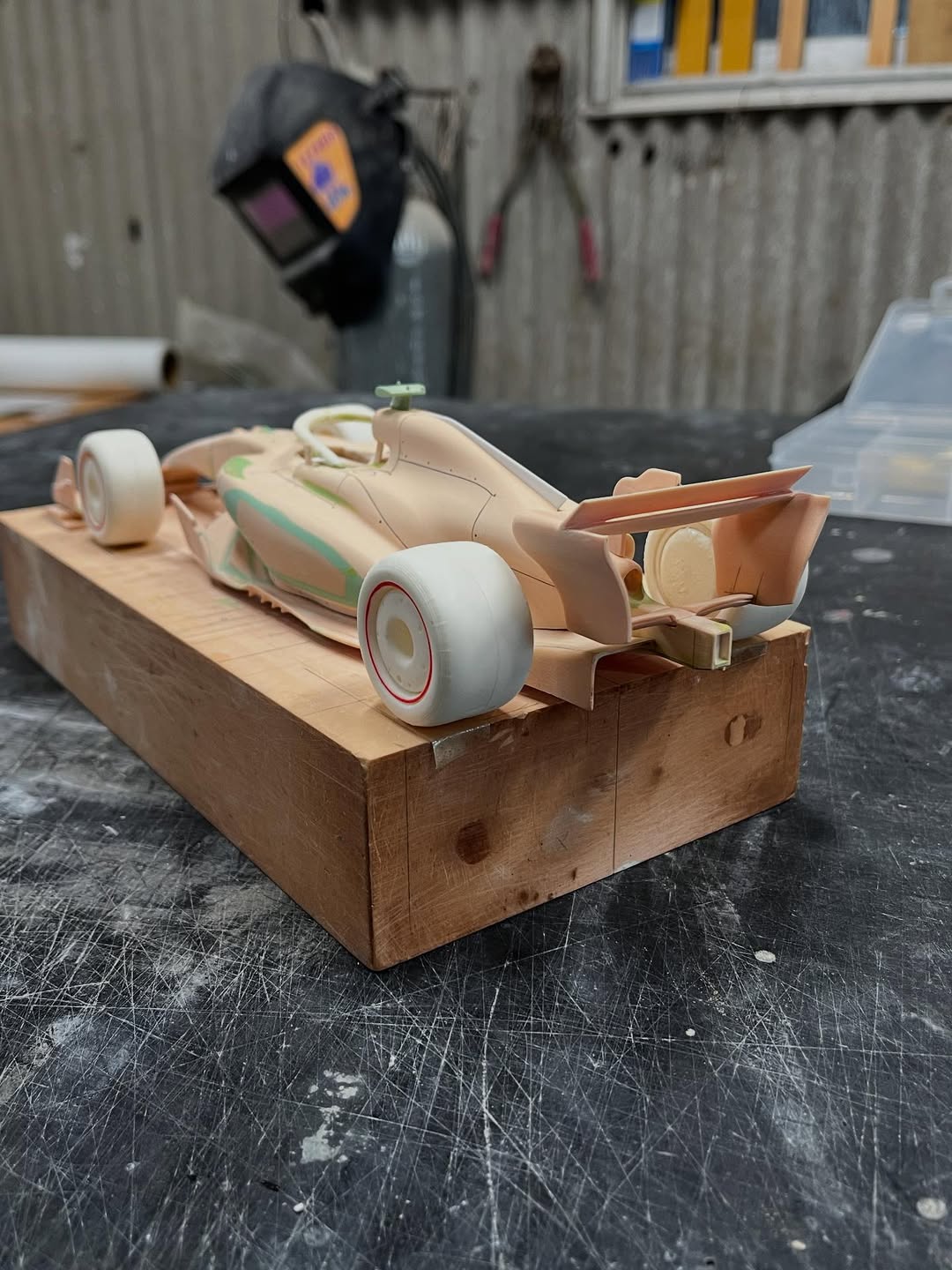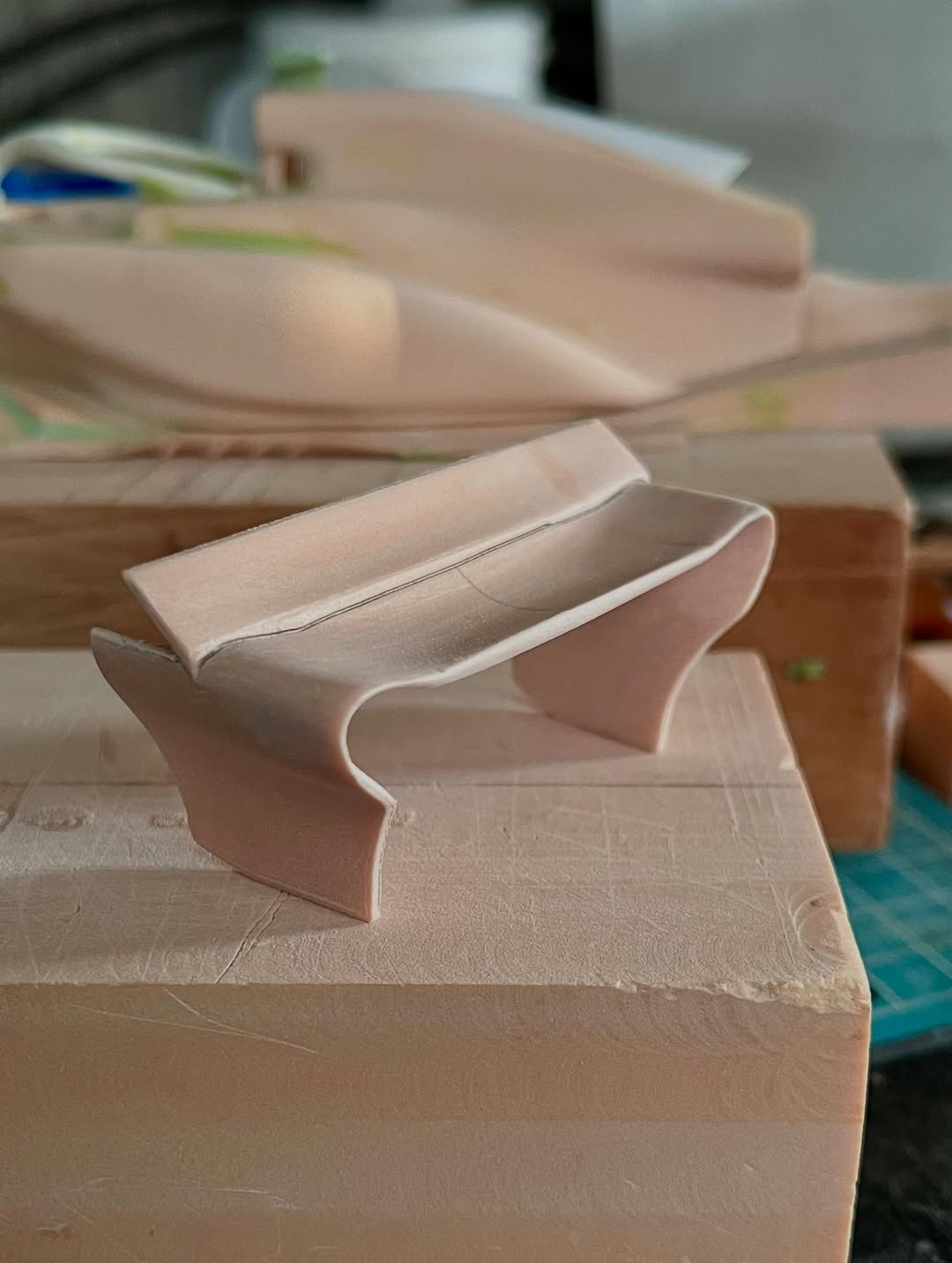 リアウイングの製作です。ここ2年は模型仲間が3Dプリンターで製作した物をそのマシンに合わせて加工してましたが、今回はF1-75以来のケミカルウッドブロックからの削り出しです。寸法の基準にしたい平面が一切ないので、画像を何度も見て頭に入れてから削っていきます。ウイング位置もケミカルウッドブロックでジグを作って保持出来るようにしておきます。