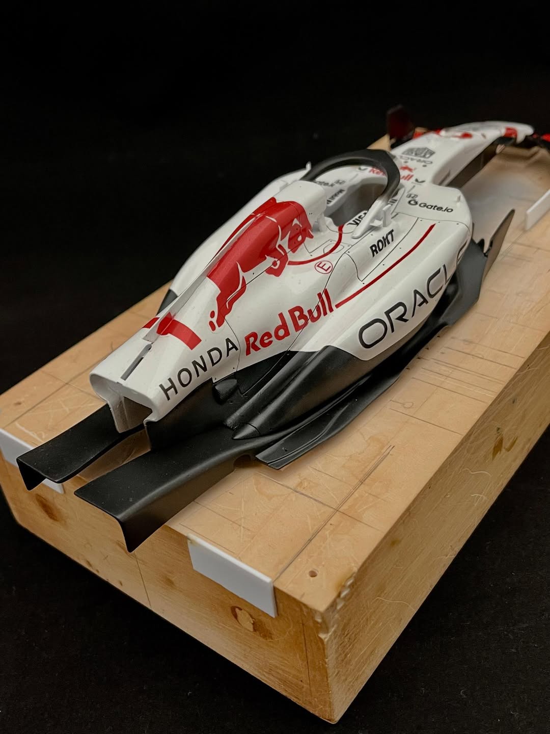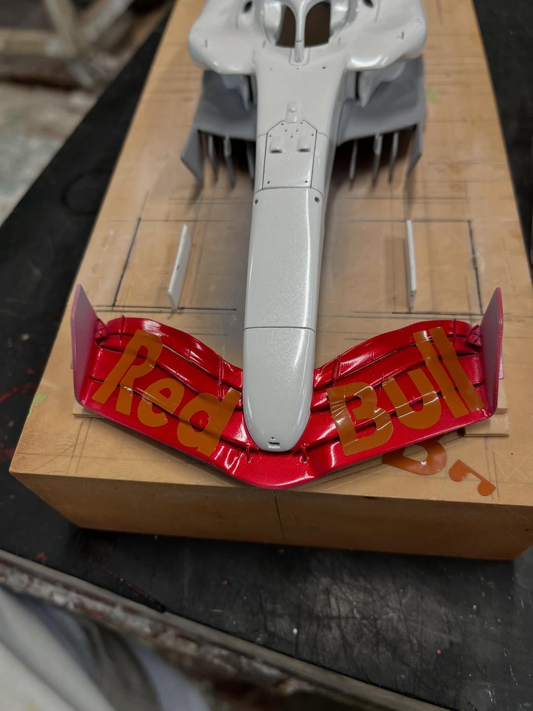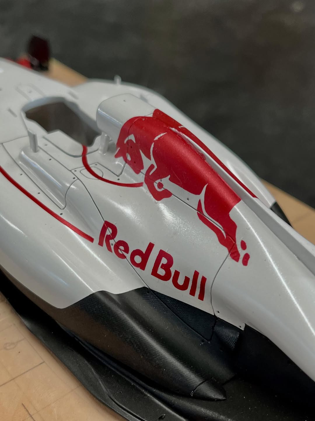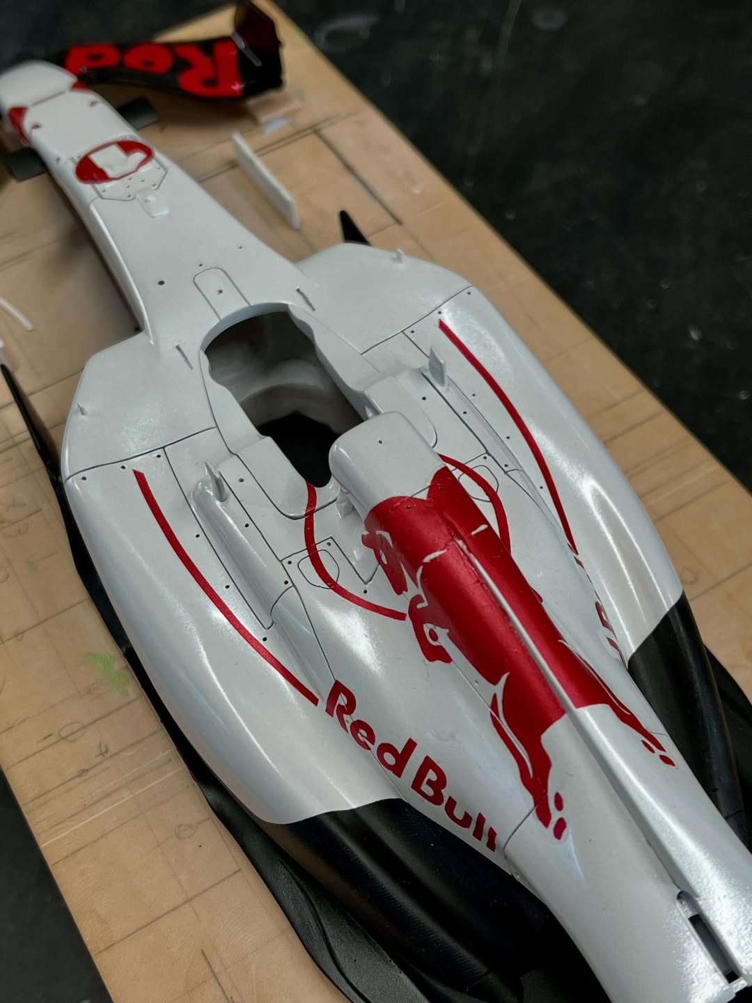 塗装に入りました。ベースとなる白はクリアーにパール粉を少し混ぜてあります。赤はパール系の赤にクリアーレッドで赤みを調整し、フロントウイングは先に赤を吹き、カッティングマシンでカットしたレッドブル文字を貼り、黒を吹いて剥がすとパールレッド文字の出来上がり。赤牛はデカール用紙にカットしたマスキングシートを貼り、薄く塗り重ねて自作デカールを貼りました、取り敢えず試作した物なので、本場はこれからです。