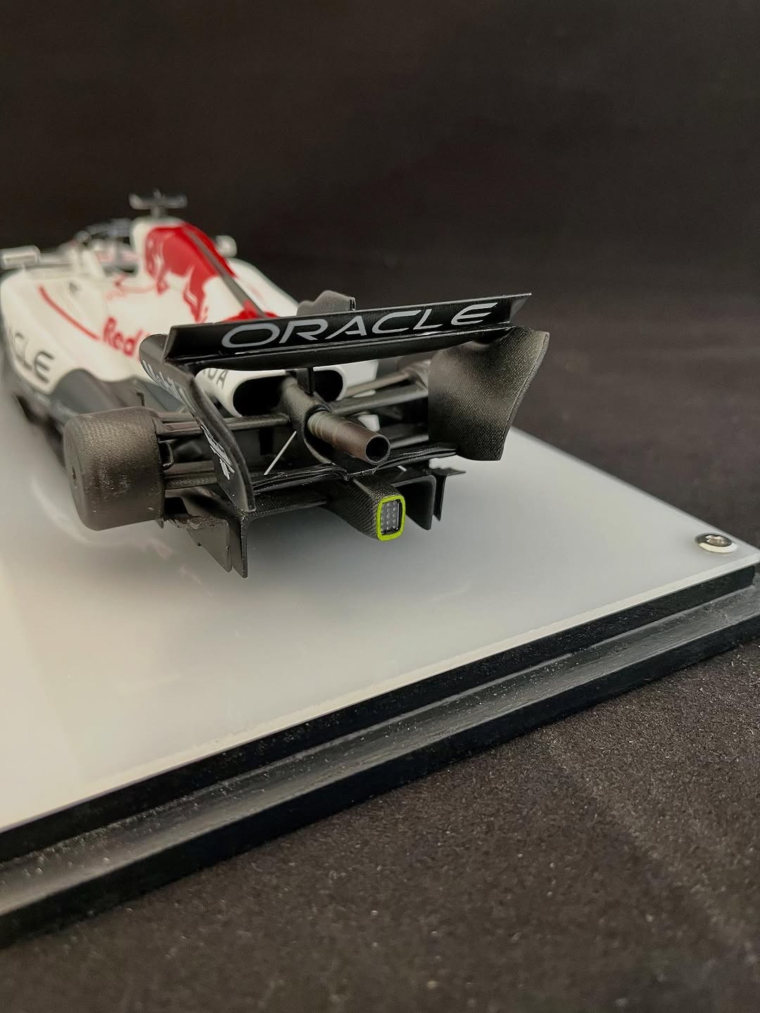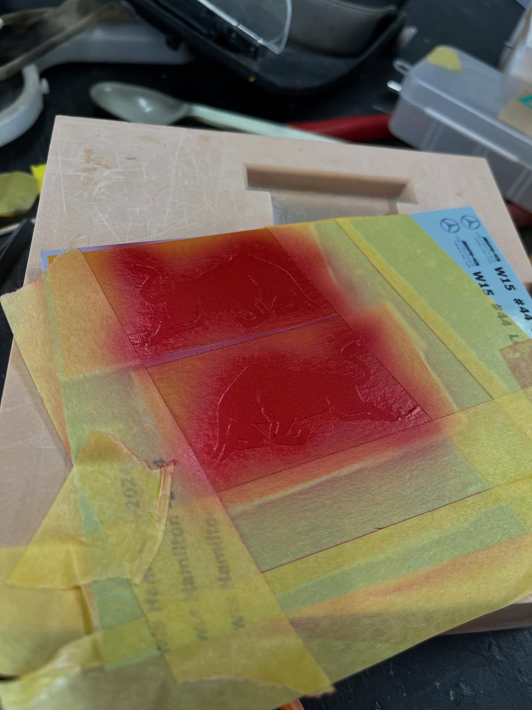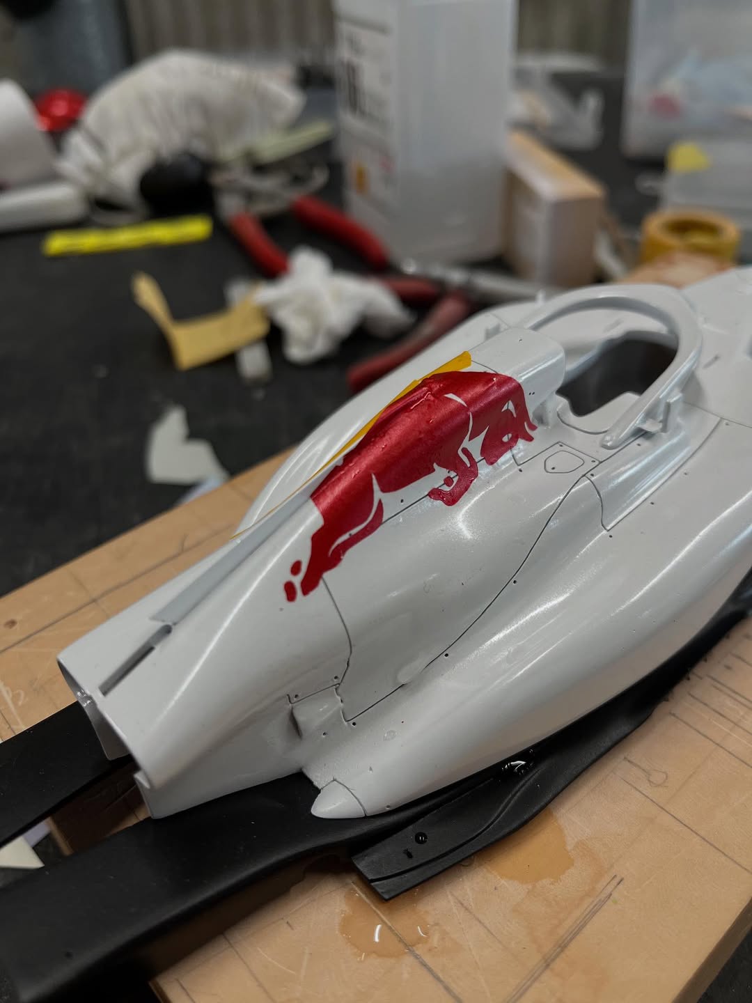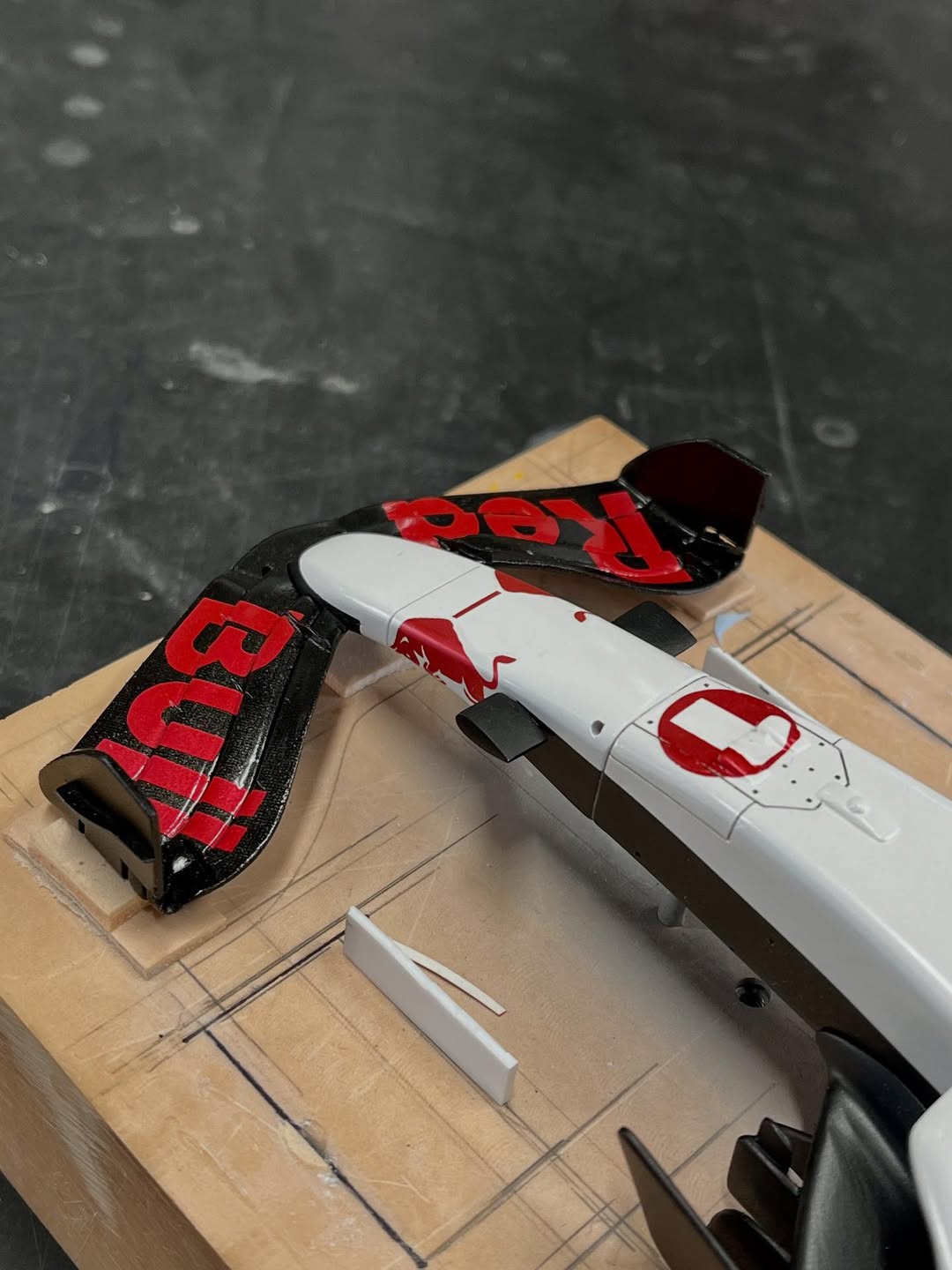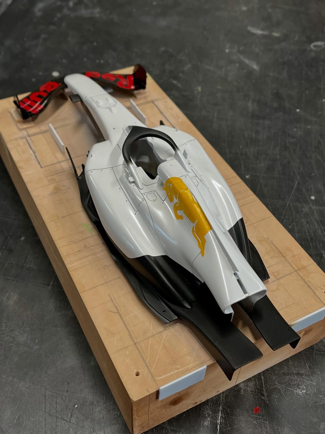 塗装に入りました。ベースとなる白はクリアーにパール粉を少し混ぜてあります。赤はパール系の赤にクリアーレッドで赤みを調整し、フロントウイングは先に赤を吹き、カッティングマシンでカットしたレッドブル文字を貼り、黒を吹いて剥がすとパールレッド文字の出来上がり。赤牛はデカール用紙にカットしたマスキングシートを貼り、薄く塗り重ねて自作デカールを貼りました、取り敢えず試作した物なので、本場はこれからです。