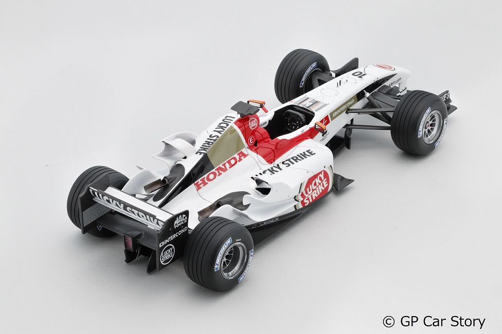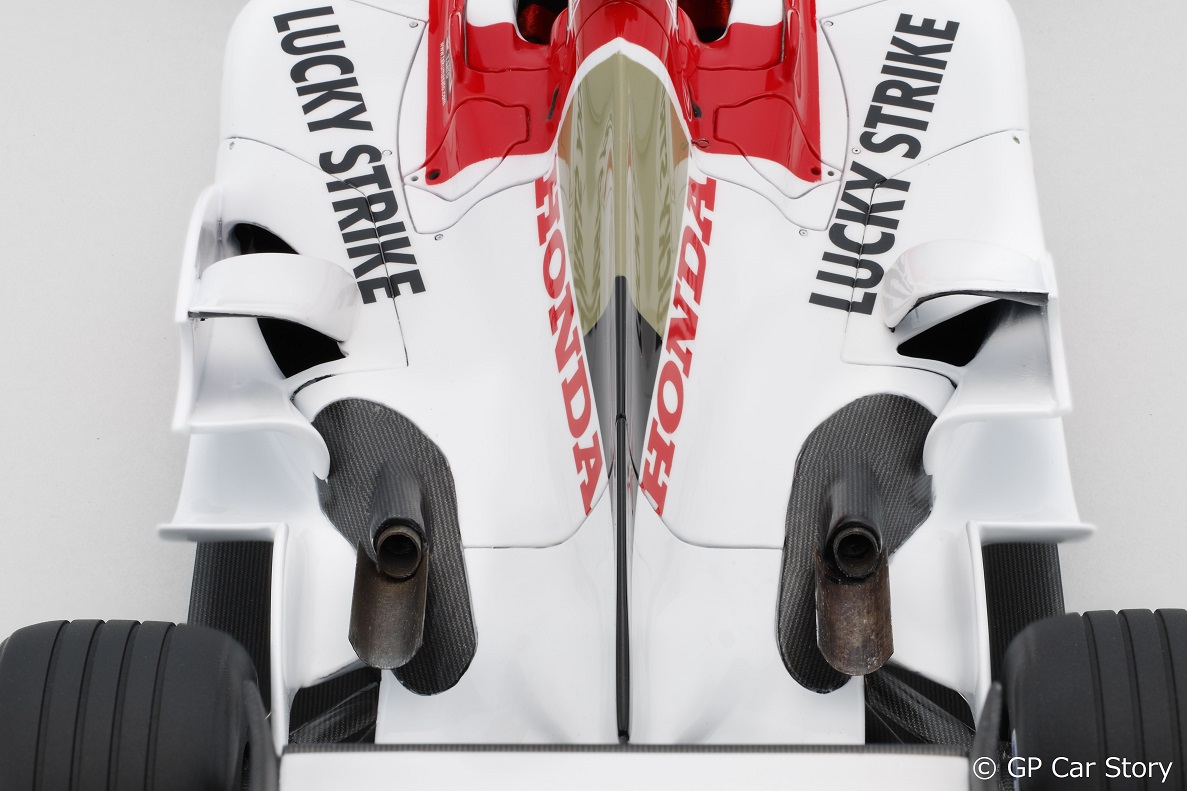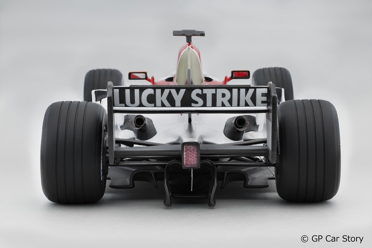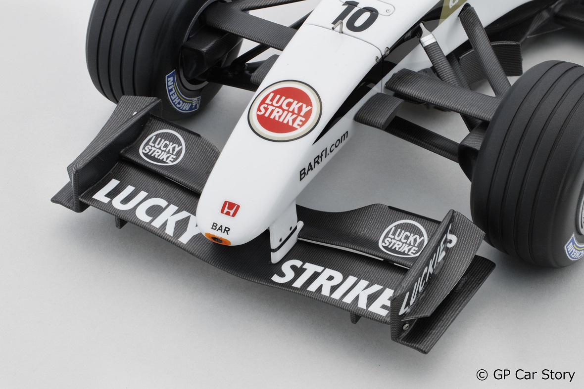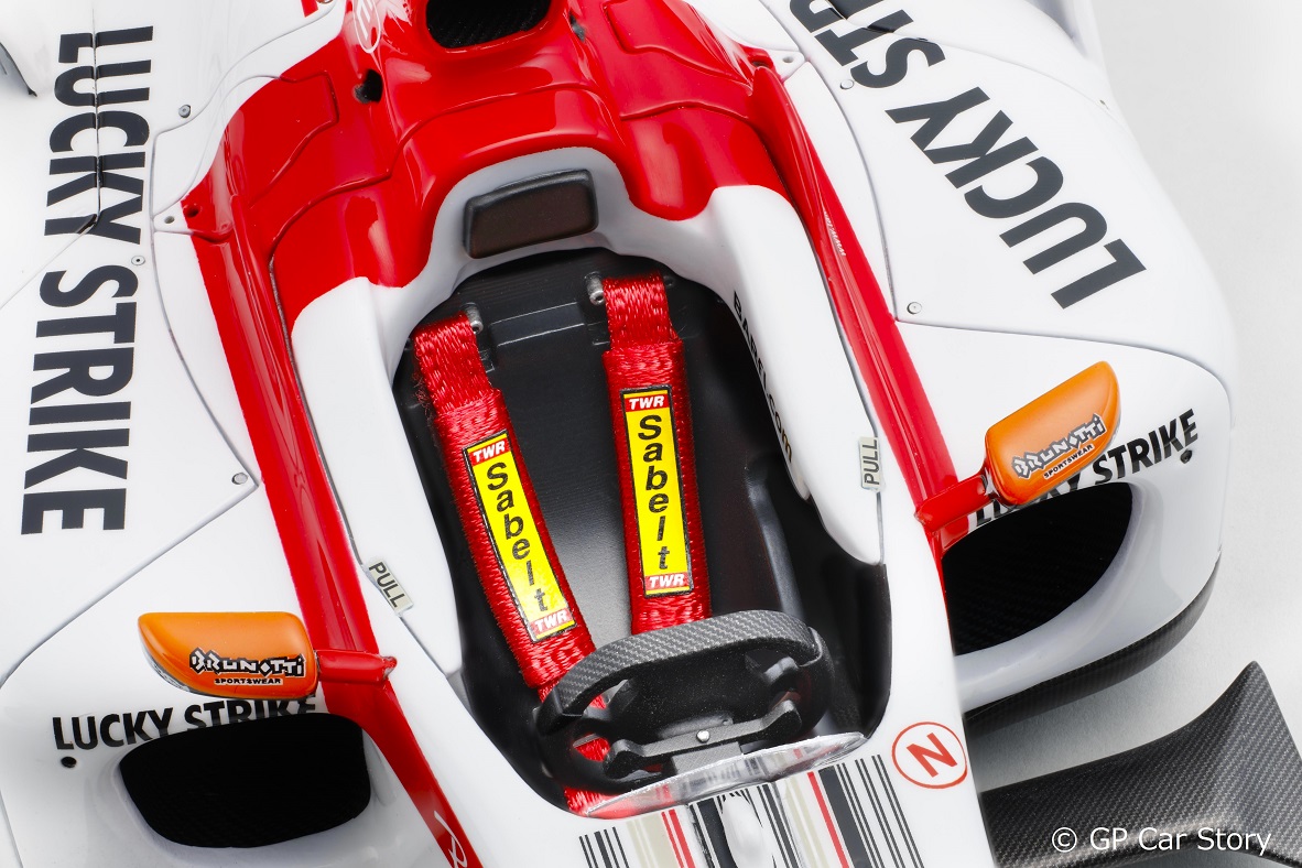 琢磨の初表彰台、アメリカGP仕様を目指して作りました。誌面でご紹介しました通り、昔作ったものの塗装を落としノーズ形状を改修して再塗装しています。ずっと気になっていたポイントでしたので、BAR006のお話を頂いた瞬間にレストア決定でした。やって良かったと思います。