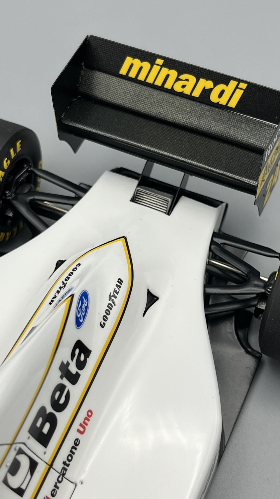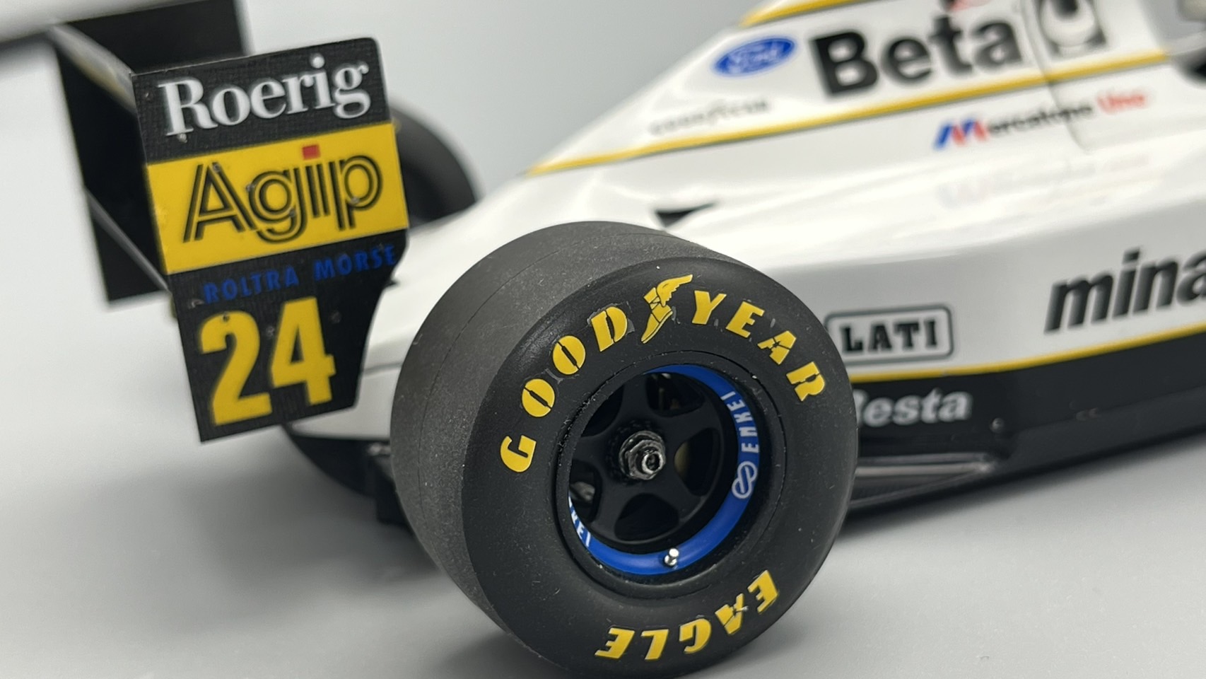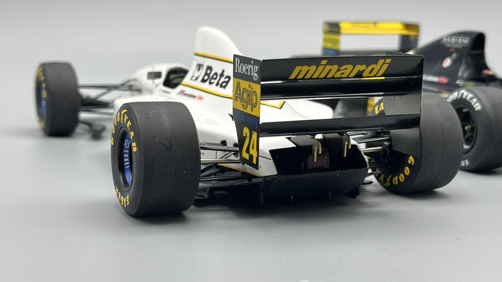 AMC ミナルディM193、完成しました! ノーズを5mm延長している以外には大きな改造なし。サイドポンツーンも少し前進させたほうがよかったかも‥。最後の黒黄白パターンのミナルディ、シンプルでいいなあ。アンテナ作り直し。カーボン柄はナイロンメッシュ使って塗装してます。フィニッシャーズで買った1/24用エアバルブ良いです。その他、ボルテックスジェネレータ吊り下げワイヤーも追加してます。