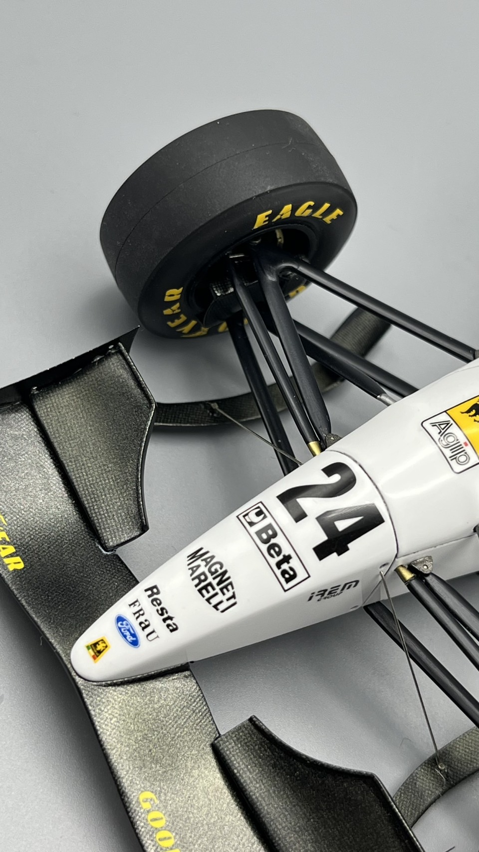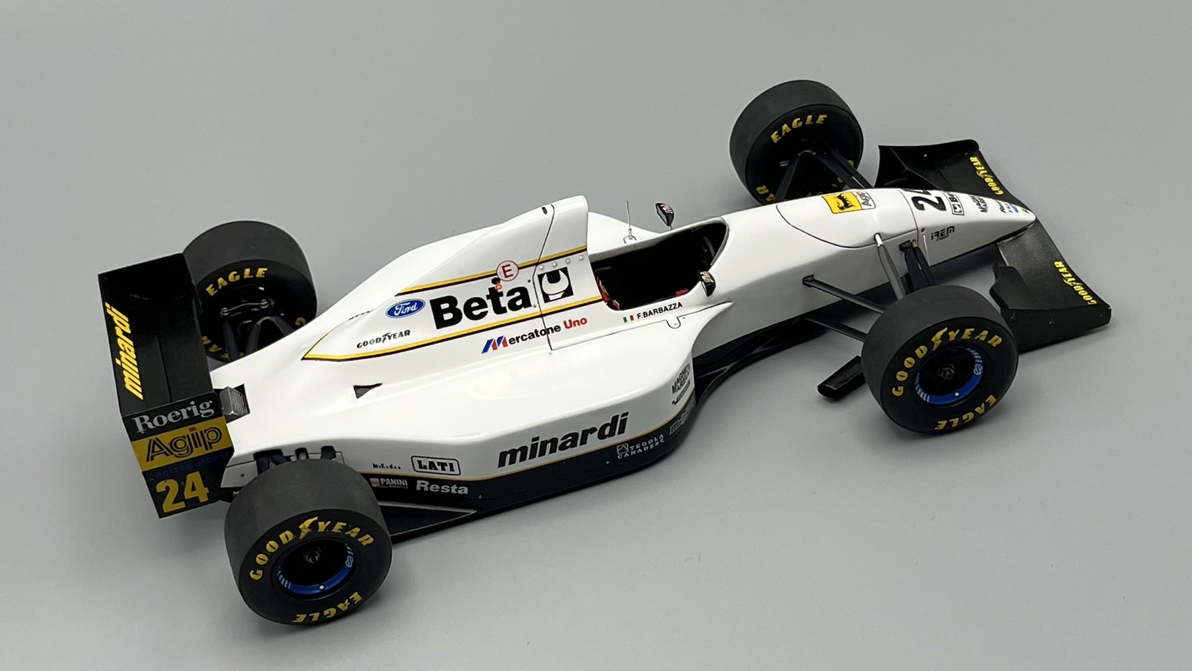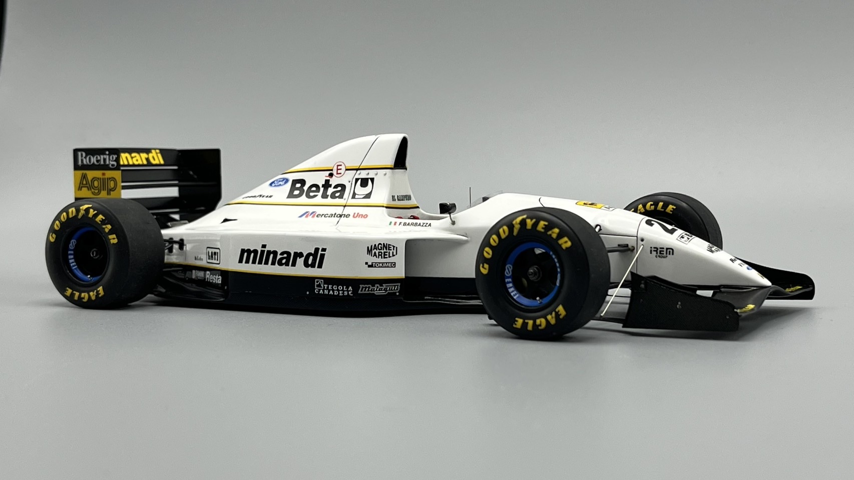 AMC ミナルディM193、完成しました! ノーズを5mm延長している以外には大きな改造なし。サイドポンツーンも少し前進させたほうがよかったかも‥。最後の黒黄白パターンのミナルディ、シンプルでいいなあ。アンテナ作り直し。カーボン柄はナイロンメッシュ使って塗装してます。フィニッシャーズで買った1/24用エアバルブ良いです。その他、ボルテックスジェネレータ吊り下げワイヤーも追加してます。