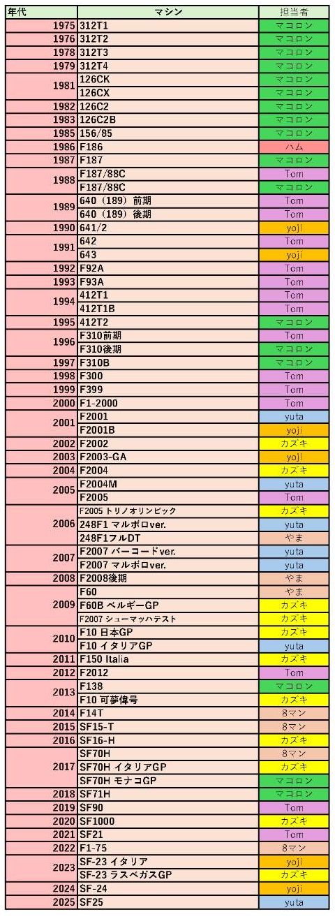 展示テーマ歴代フェラーリの展示担当リスト(1/20スケール版)です。もともと完成していたもの、レストアしたもの、今回用に新規製作したものまで含めてこれだけの台数を並べたいと思っています。この様な展示を見られるのはココくらいではないでしょうか。1/12スケールもいくつか並べます。フェラーリ以外のマシンも展示します。